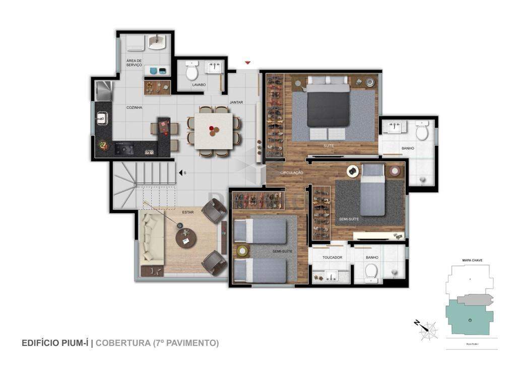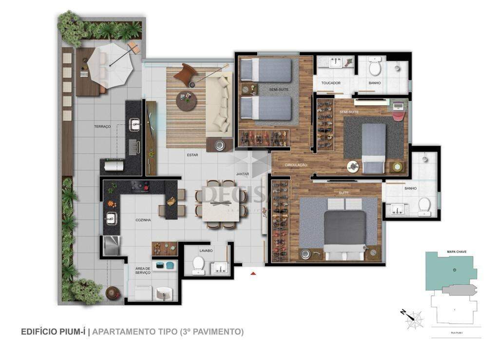 Apto 03 quartos: Sala para 02 ambientes, 03 quartos, sendo 01 suíte, banho social (com toucador), lavabo, cozinha estilo americana, área de serviços.