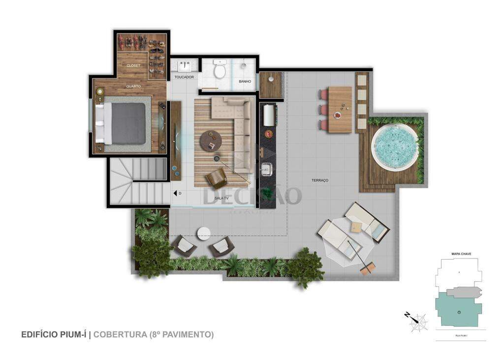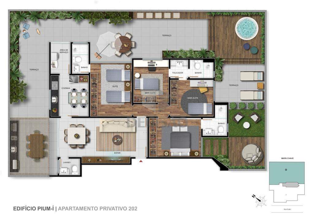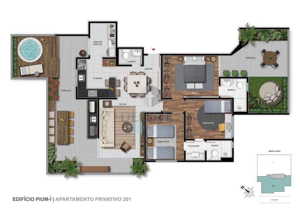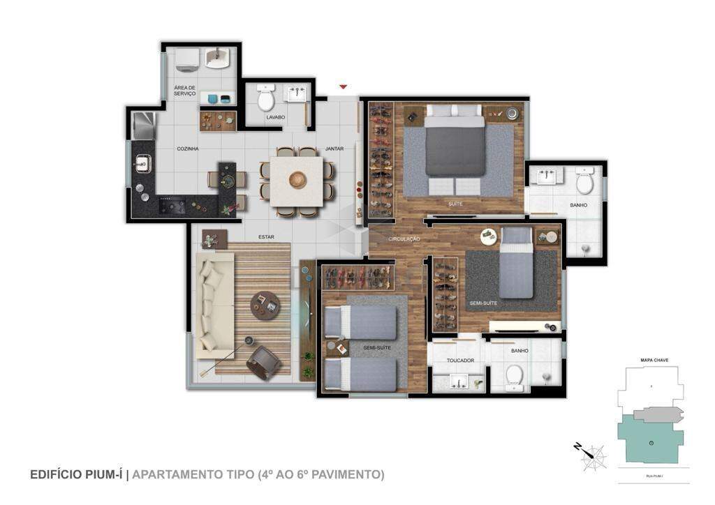 Apto 04 quartos: Sala para 02 ambientes, 04 quartos, sendo 01 suíte, banho social (com toucador), lavabo, cozinha estilo americana, área de serviços.