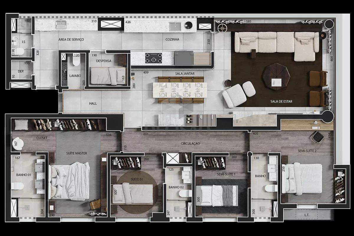 Apto: Salão para 02 ambientes, lavabo, 04 quartos, sendo 02 suítes e 02 semi-suítes, closet, cozinha ampla, área de serviços e dce.