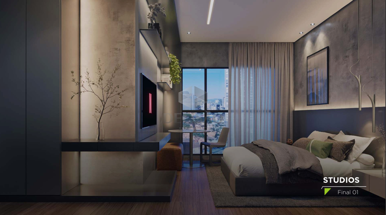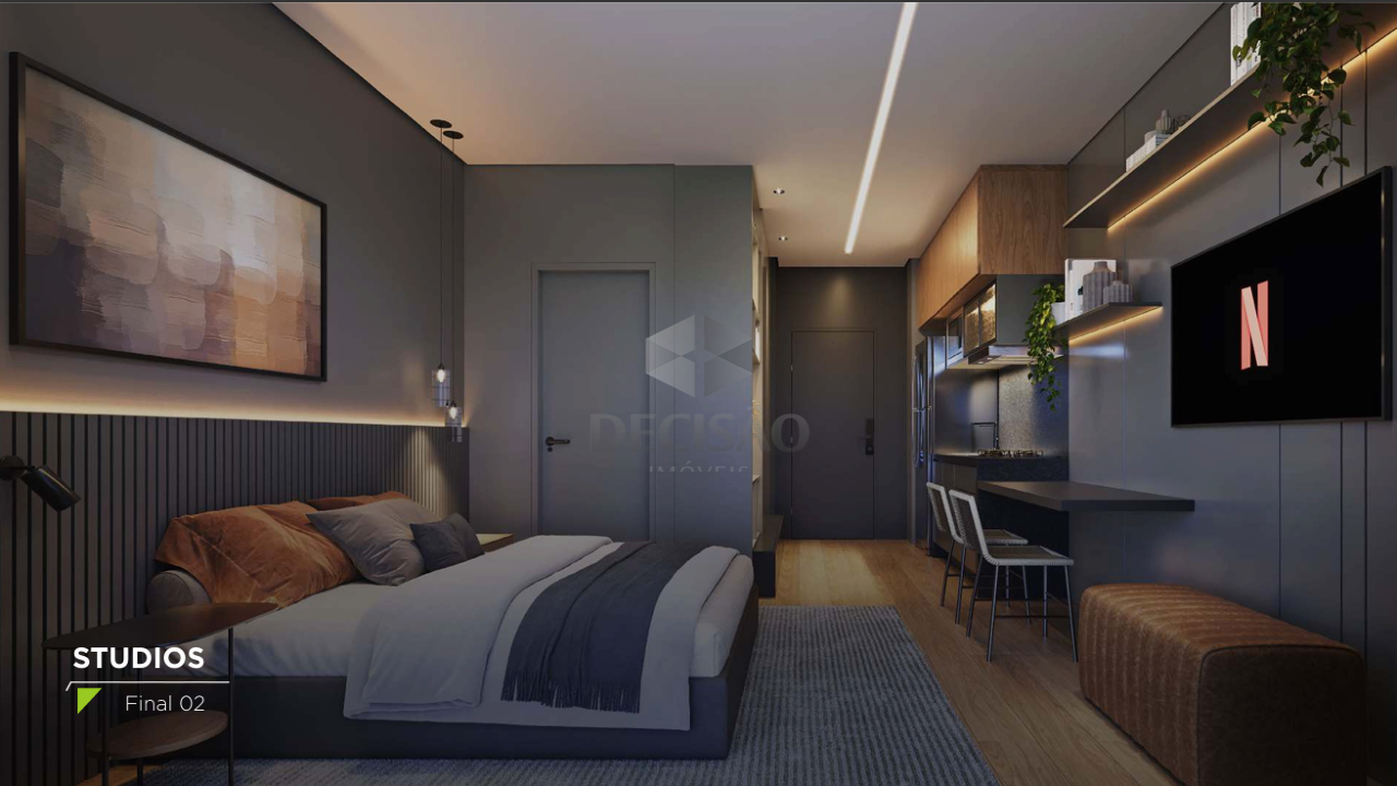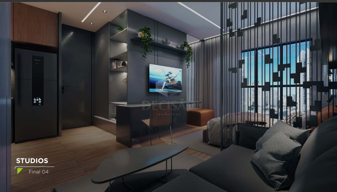 Apto Studio: Sala ampla ambiente aberto integrado, banho com cozinha conjugada.