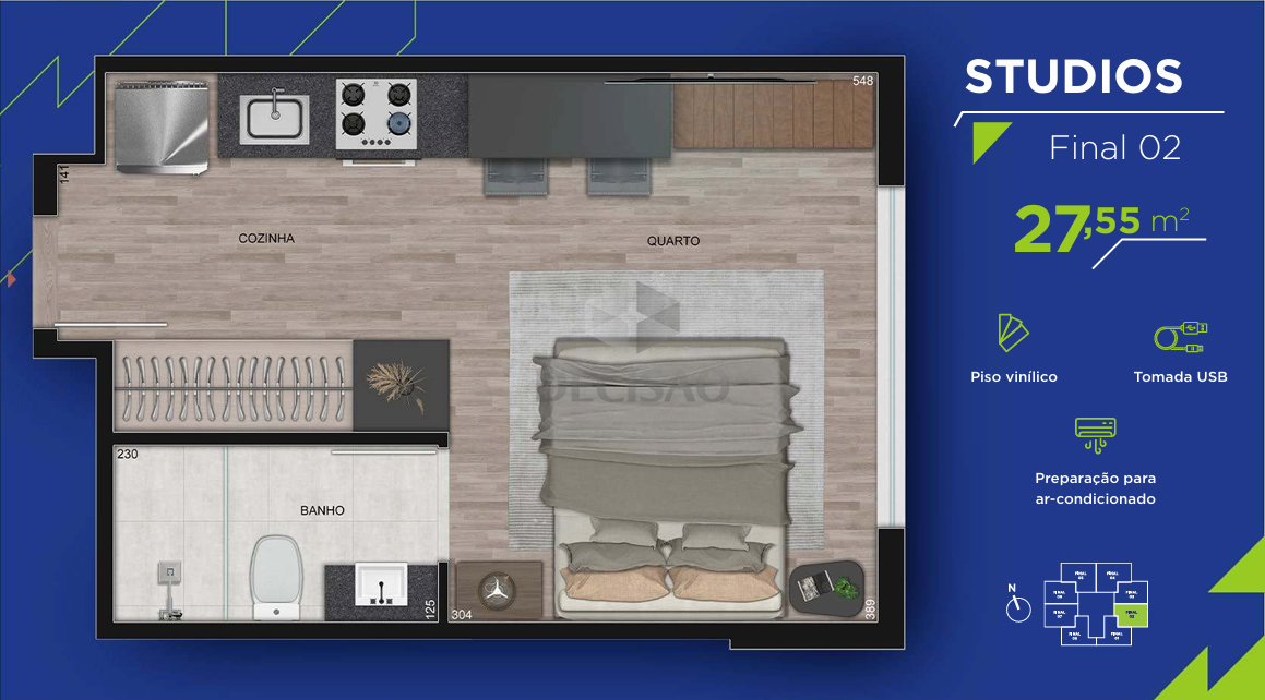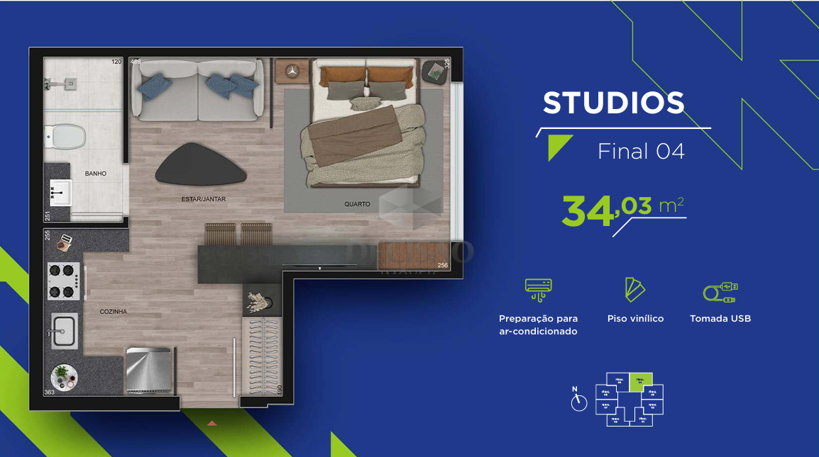 Apto: Variedades em opções de plantas, oferecendo a opção de apartamento studio, 02 quartos e áreas privativas (vide tabela).