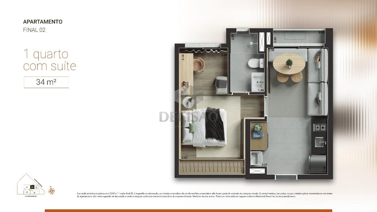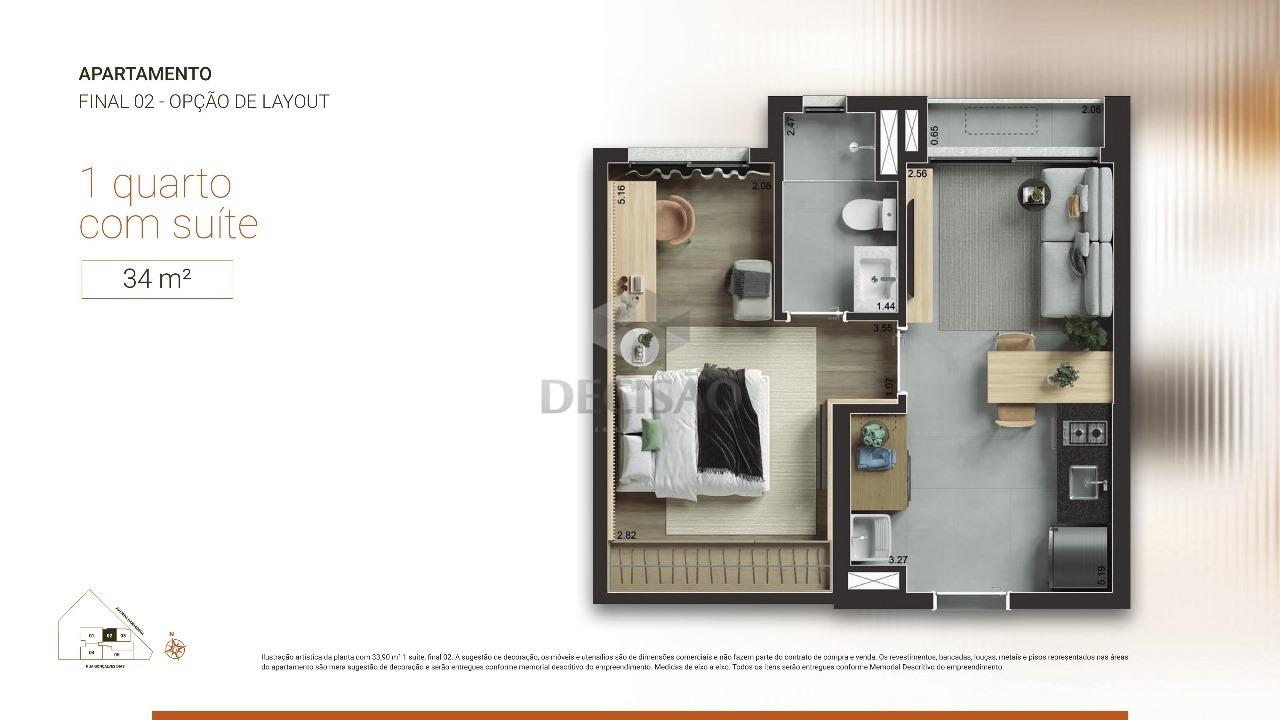 Apto 01 quarto: Sala para 02 ambientes, 01 suíte, cozinha americana, área de serviços.