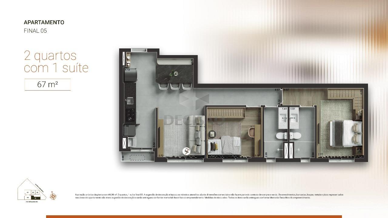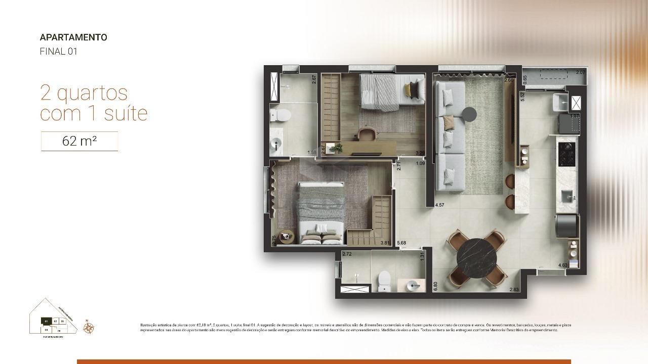 Apto 02 quartos: Sala para 02 ambientes, 02 quartos, sendo 01 suíte, banho social, cozinha americana, área de serviços.