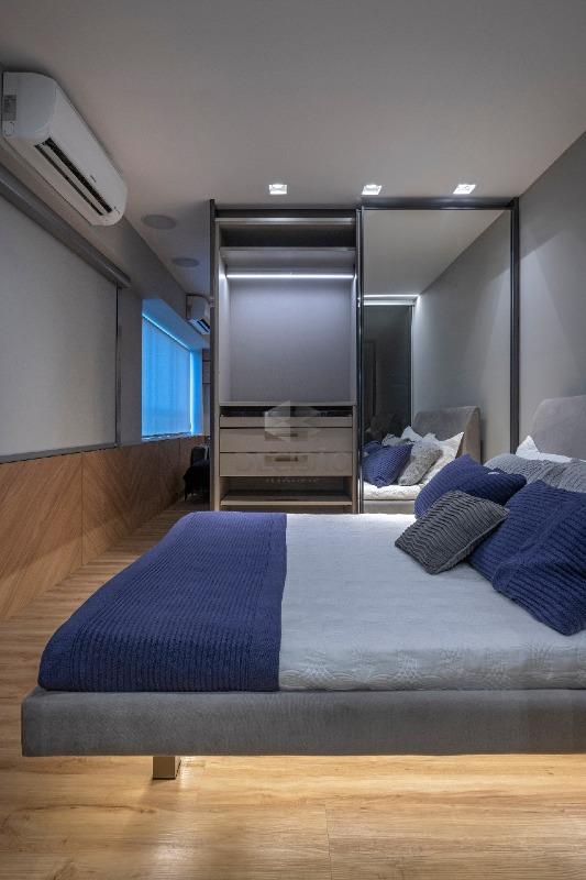 Sala com ar, cozinha integrada com armários e painéis, banho com armários, box, toucador, quarto com ar e armários.