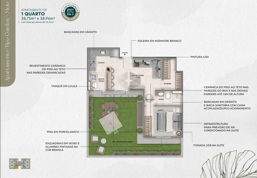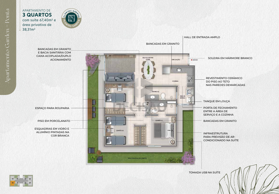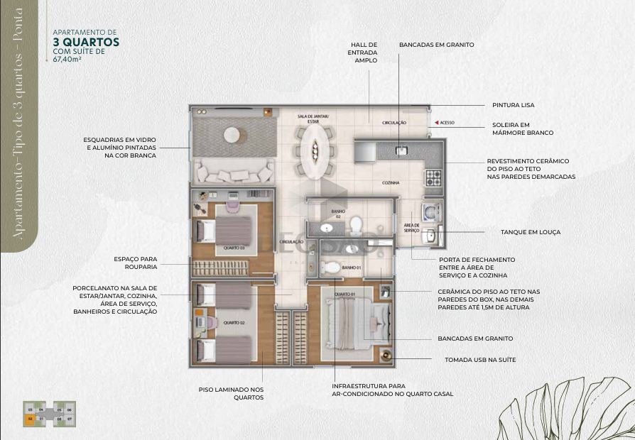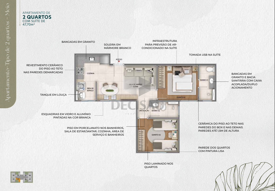 Apto 02 quartos: Com 47,70m² - Sala para 02 ambientes, 02 quartos sendo 01 suíte, banho social, cozinha, área de serviços.