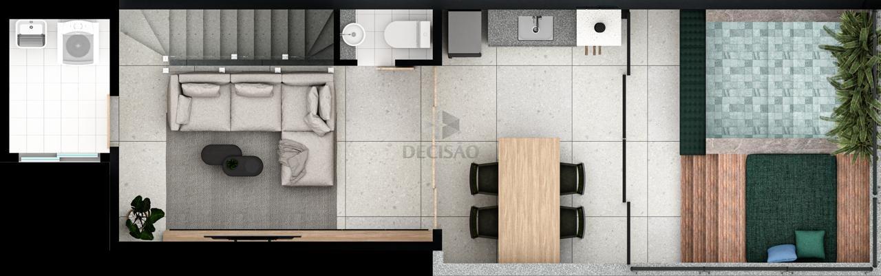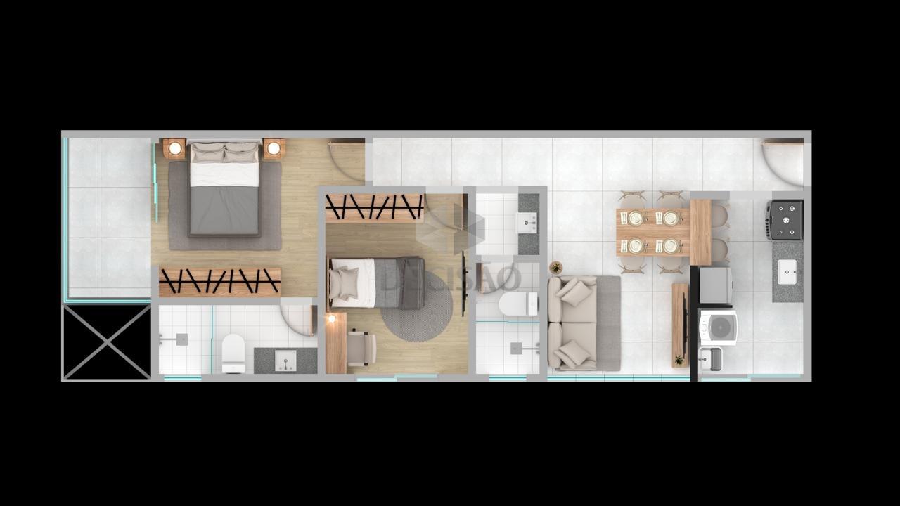 Apto: Sala para 02 ambientes (em porcelanato), 02 quartos, sendo 01 suíte, banho social, cozinha americana, área de serviços.