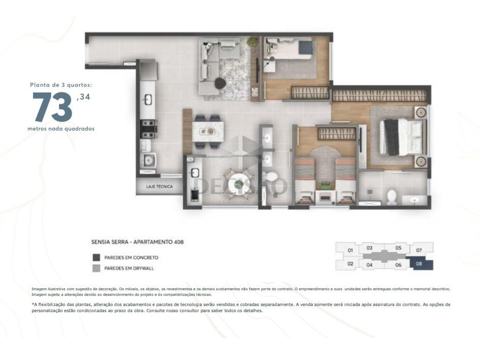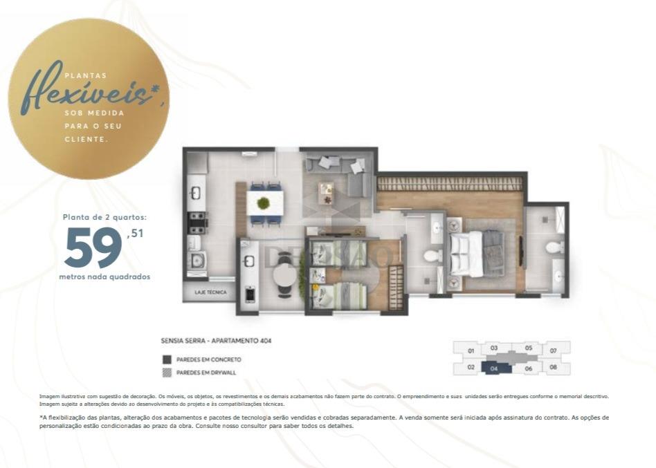Apto 02 quartos: Salão (piso em porcelanato), varanda gourmet, laje técnica para ar-condicionado, 02 quartos (piso em laminado), sendo 01 suíte e banho social, cozinha estilo americana e área de serviços.