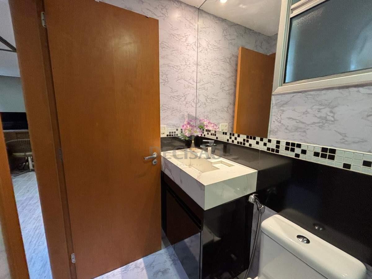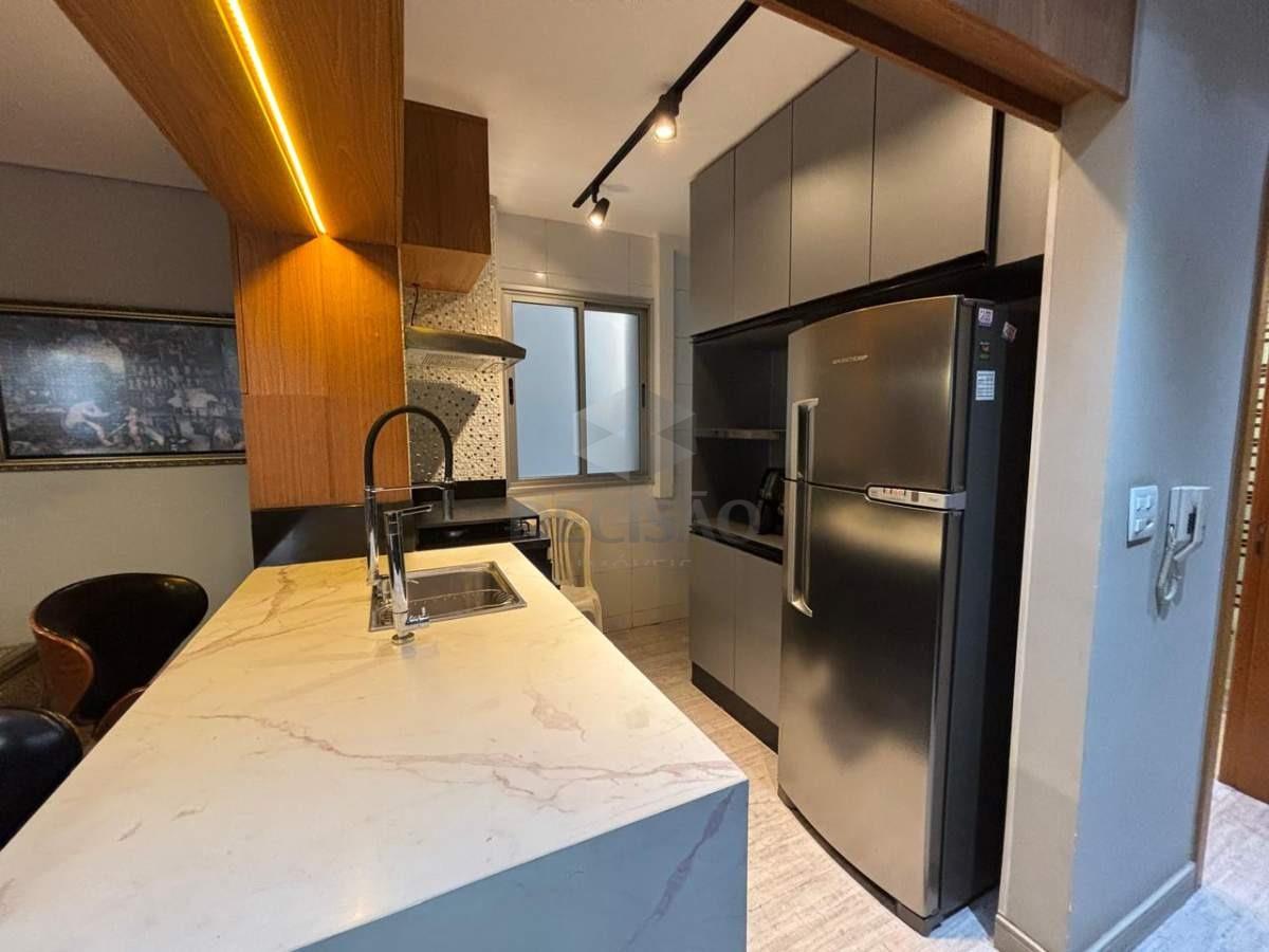 Sala para 02 ambientes (em porcelanato), 02 quartos,( quarto de solteiro transformado em escritório, com painéis para fechar o ambiente), sendo 01 suíte (com box, armários, espelho), banho social (com box, armários, espelho), cozinha americana com bancada em granito, com armários planejados, área de serviços com armários.