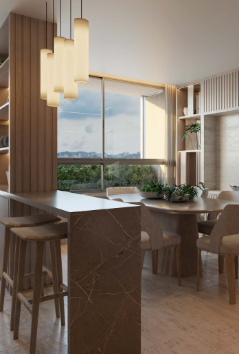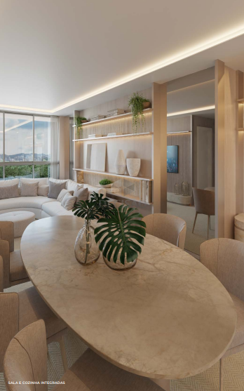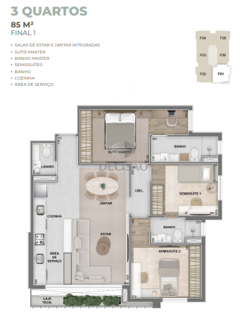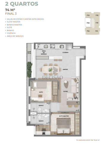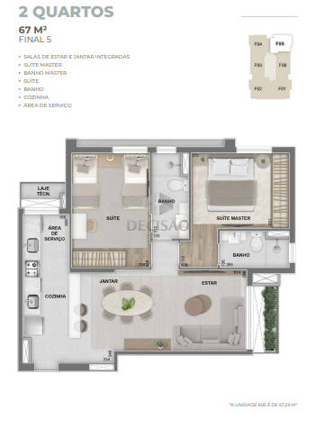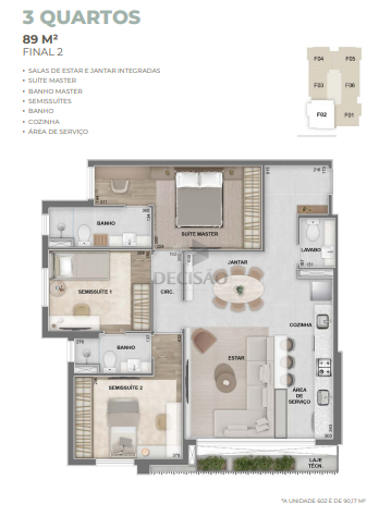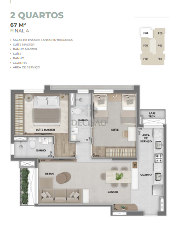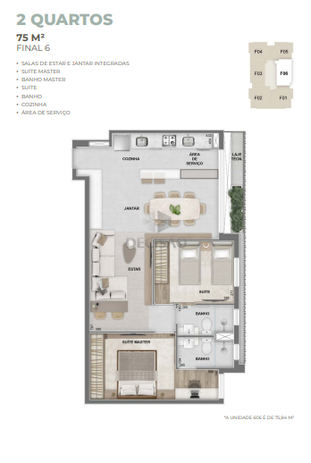 Apto 02 quartos: metragens variadas (vide tabela) - Sala de estar e sala de jantar integradas, 02 quartos, sendo 01 suíte (master), suíte, área de serviços.