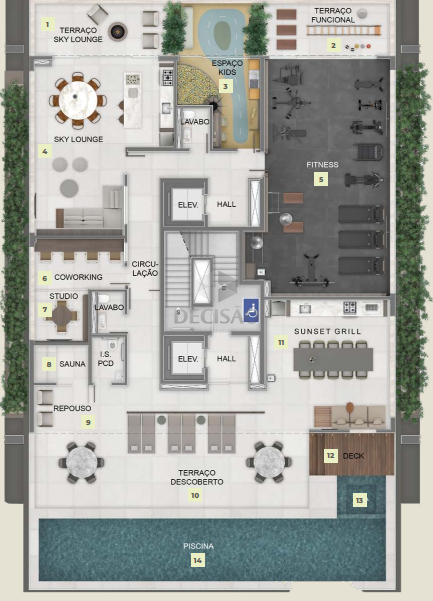 Prédio: Alto luxo, torre única com 19 pavimentos, sendo apartamentos de 02 e 03 quartos, 56 unidades (de 02 quartos - 01 suíte master, suíte com banho reversível para o social), 28 unidades (de 03 quartos - suíte master, 02 semi-suítes - 01 e 02 vagas) guarita 24 horas, sistema de segurança, lazer no rooftop com vista espetacular, piscina, sauna, fitness, sky lounge, sunset grill, spa, lounge, espaço kids+ coworking, bicicletário, serviços de pay per use.