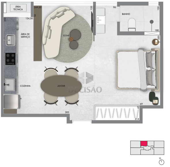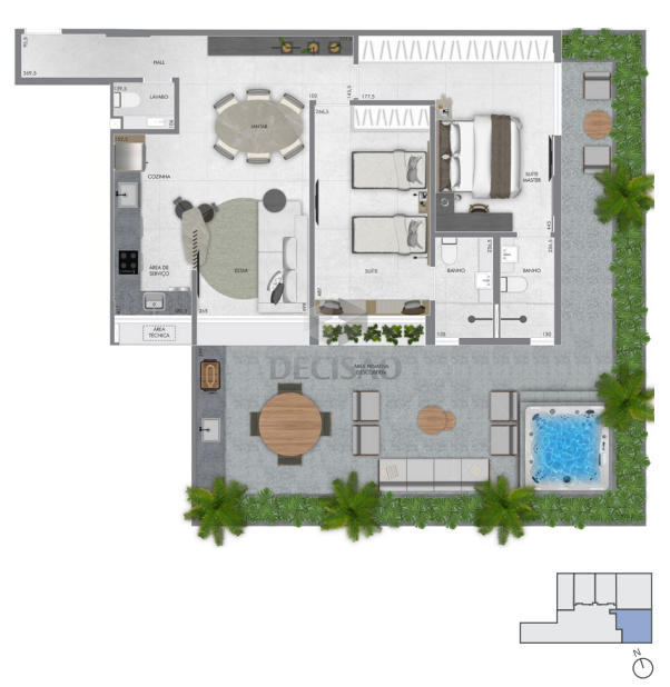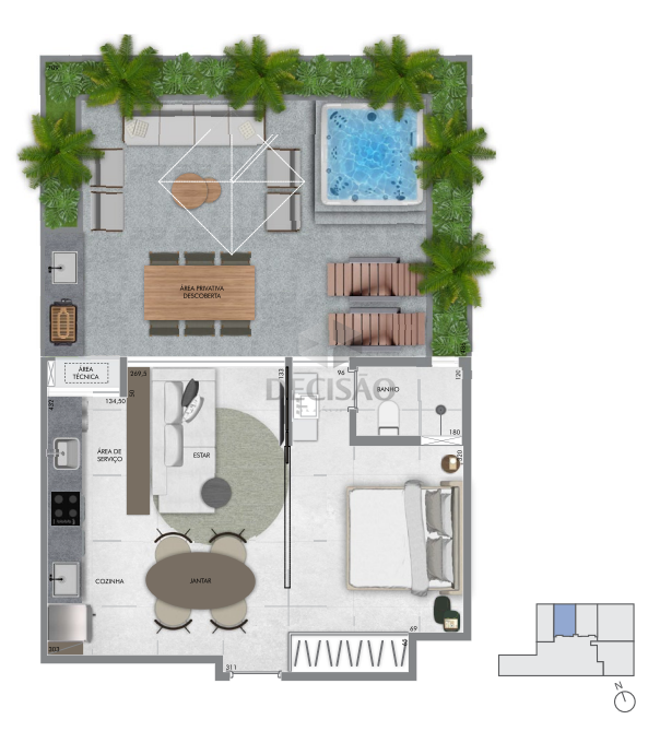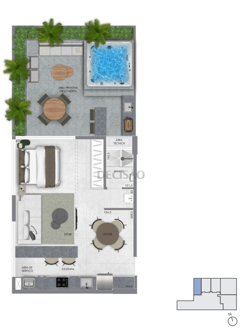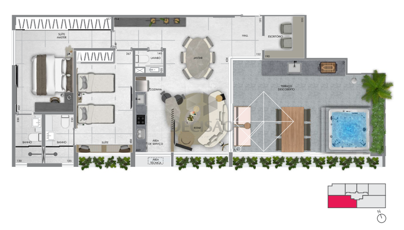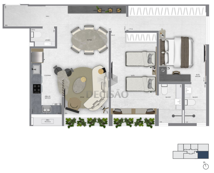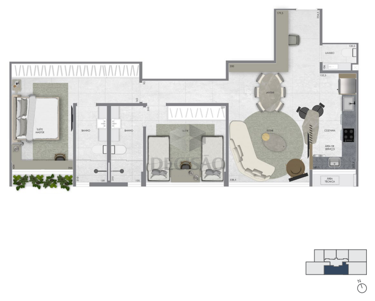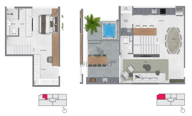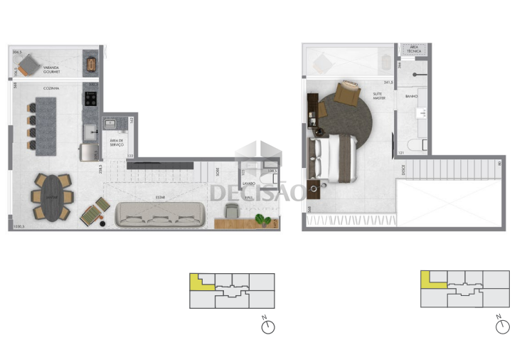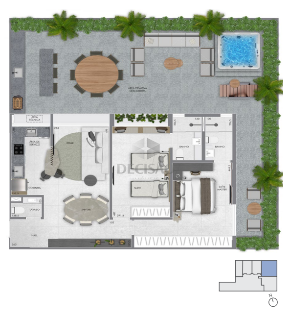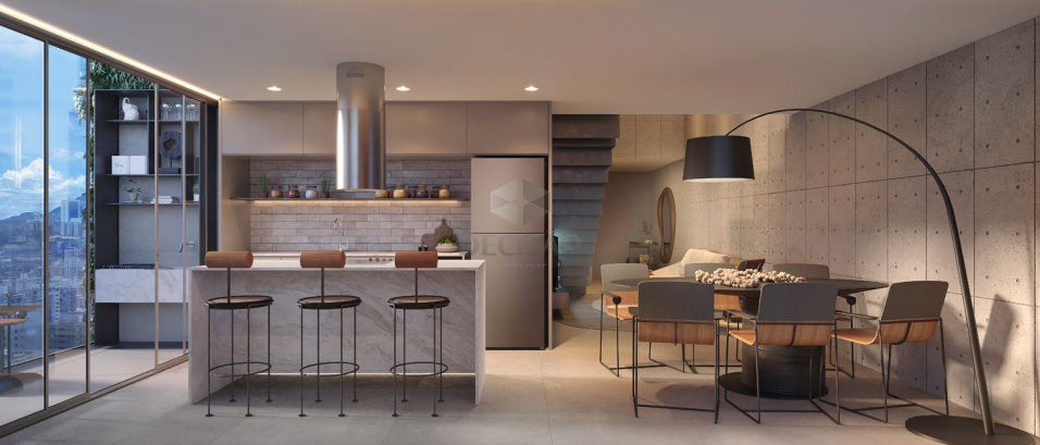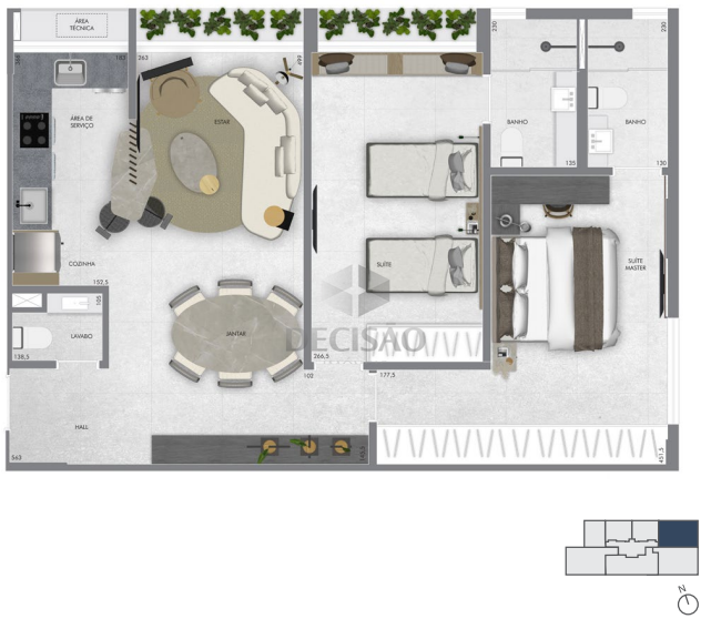Apto 02 quartos: Sala para 02 ambientes, lavabo, escritório, 02 quartos, sendo 02 suítes (01 master), cozinha americana, área de serviços.