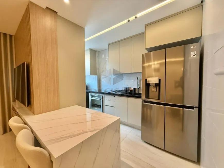 Apto: Sala para 02 ambientes, com lavabo, 02 suítes com armários, banhos (montados), cozinha estilo americana planejada com armários, área de serviços com armários.