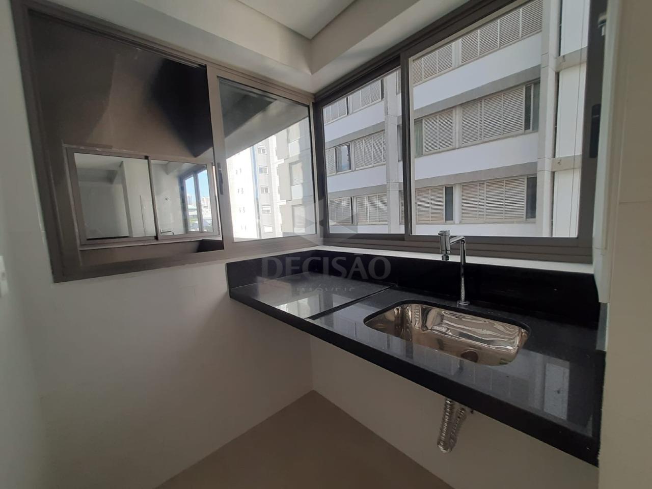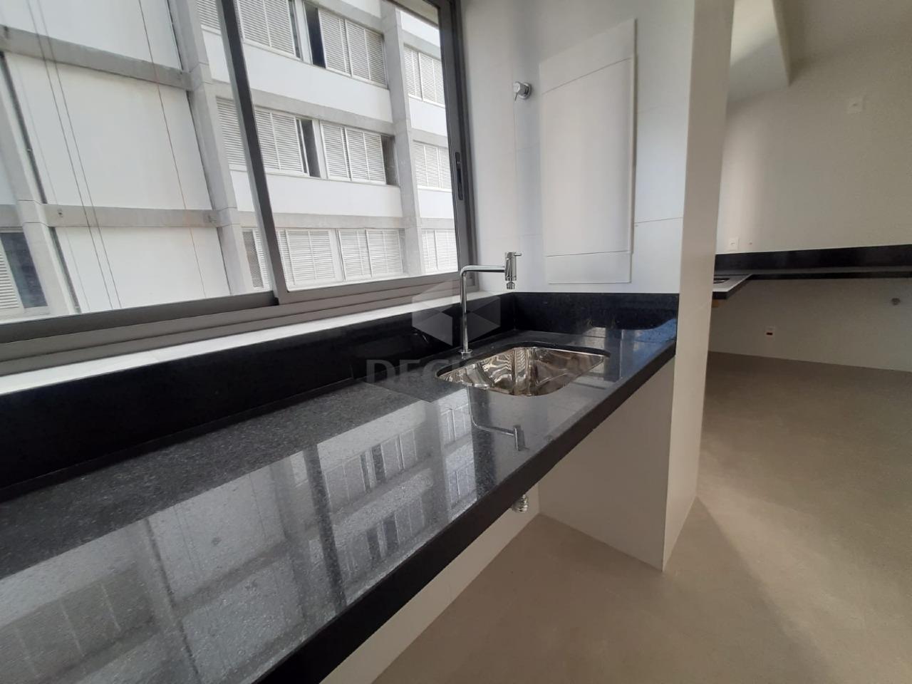 Sala em "L" para 2 ambientes com janelão, lavabo, 02 quartos, sendo 02 suítes , vão para rouparia, banhos com cubas sobre postas, cozinha americana com bancadas de granito, área de serviços separada.