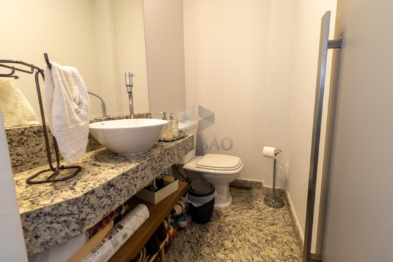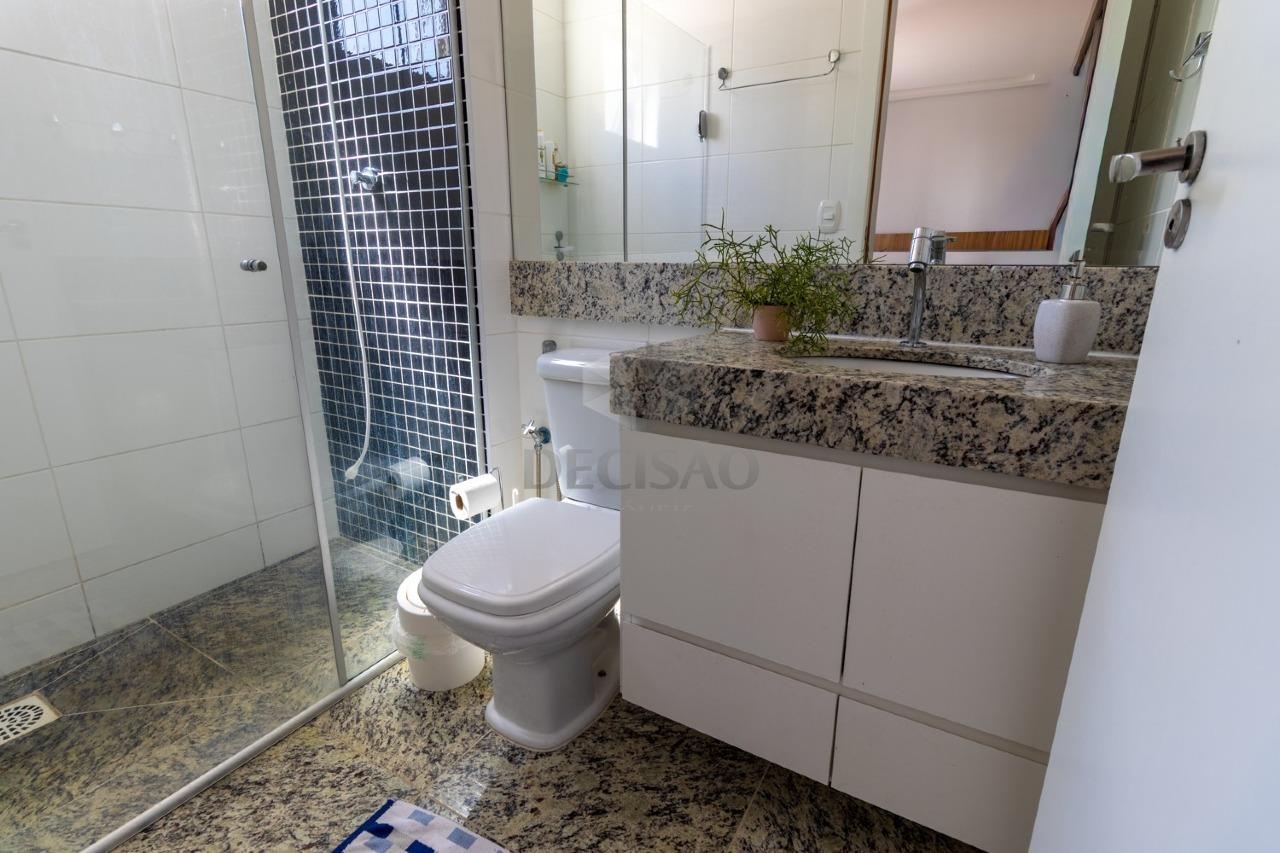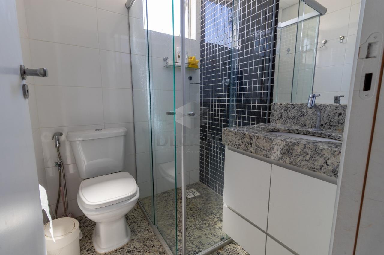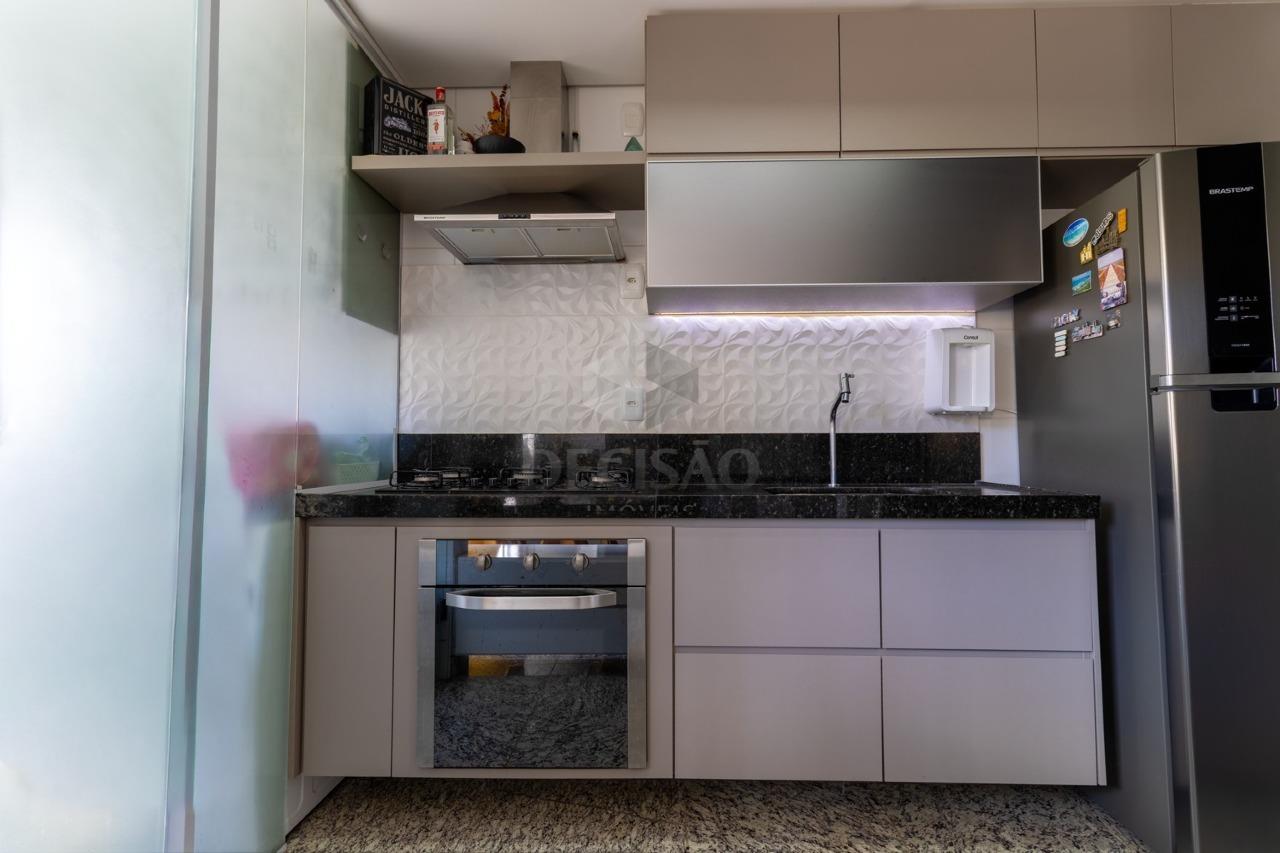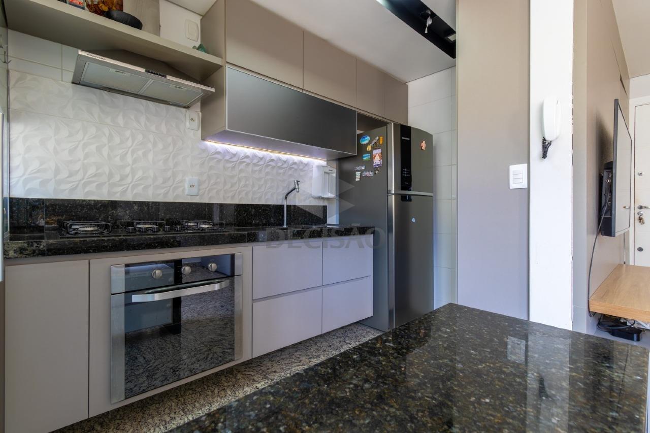 Sala para 02 ambientes (piso em granito) com bancada americana e lavabo, 02 quartos com armários (piso em laminado), sendo 02 suítes (com bancada, armário e box de vidro), cozinha com armários, área de serviços com armários.