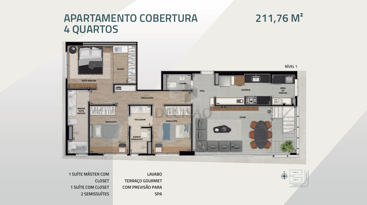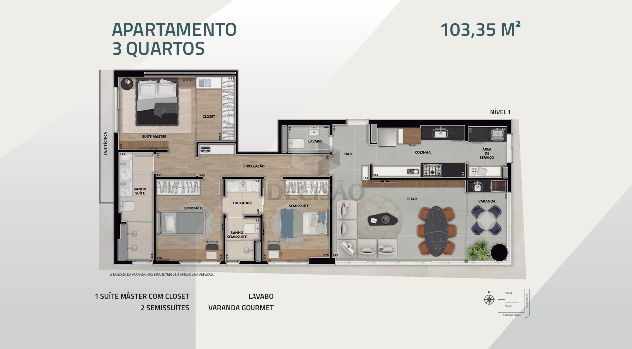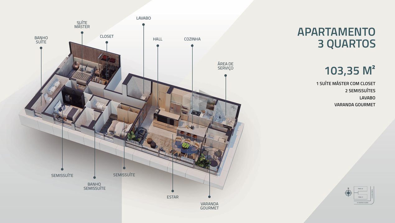 Sala para 02 ambientes, lavabo, varanda gourmet, 03 quartos, sendo 01 suíte (com closet), e 02 semi-suítes, cozinha , área de serviços.