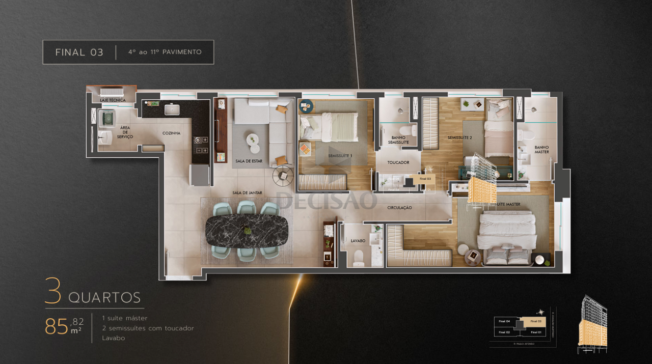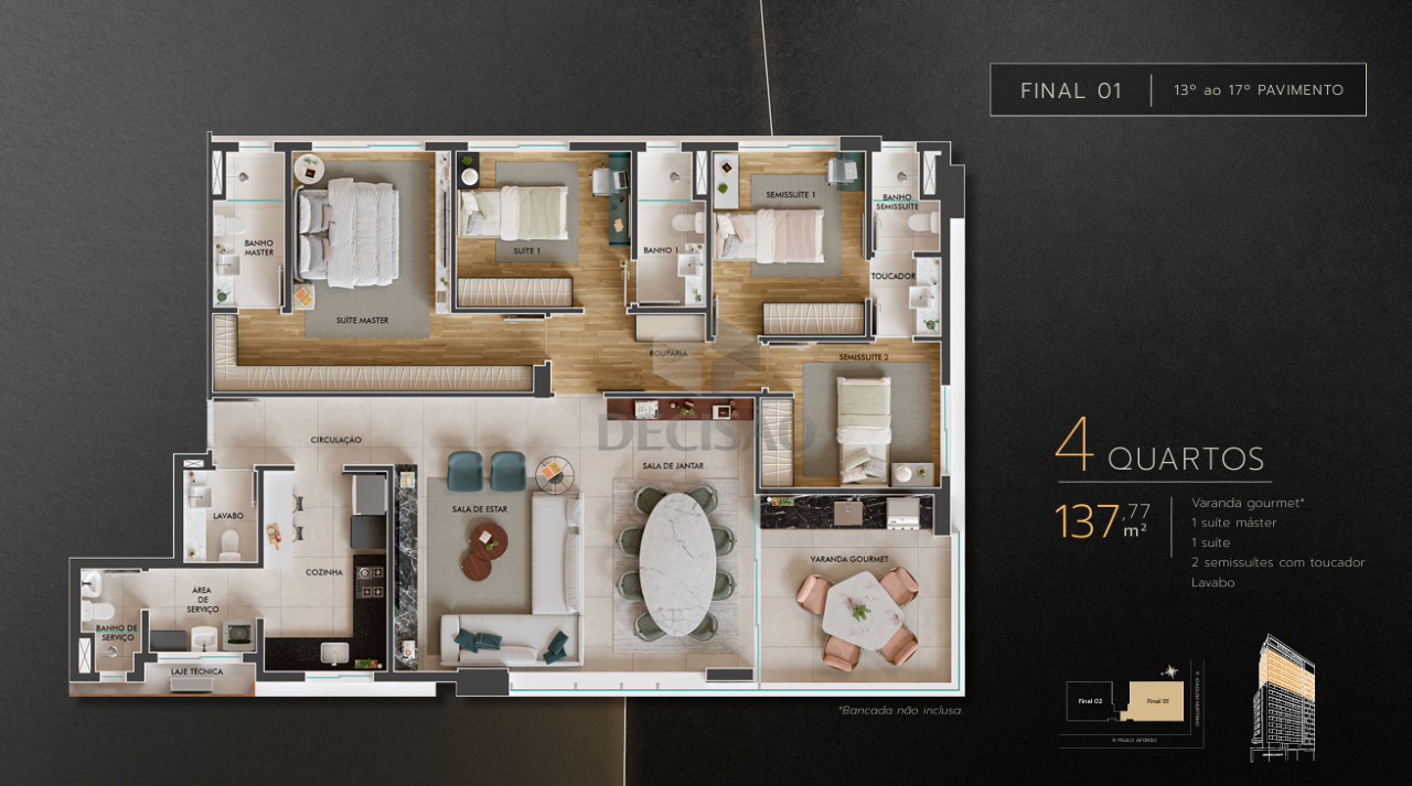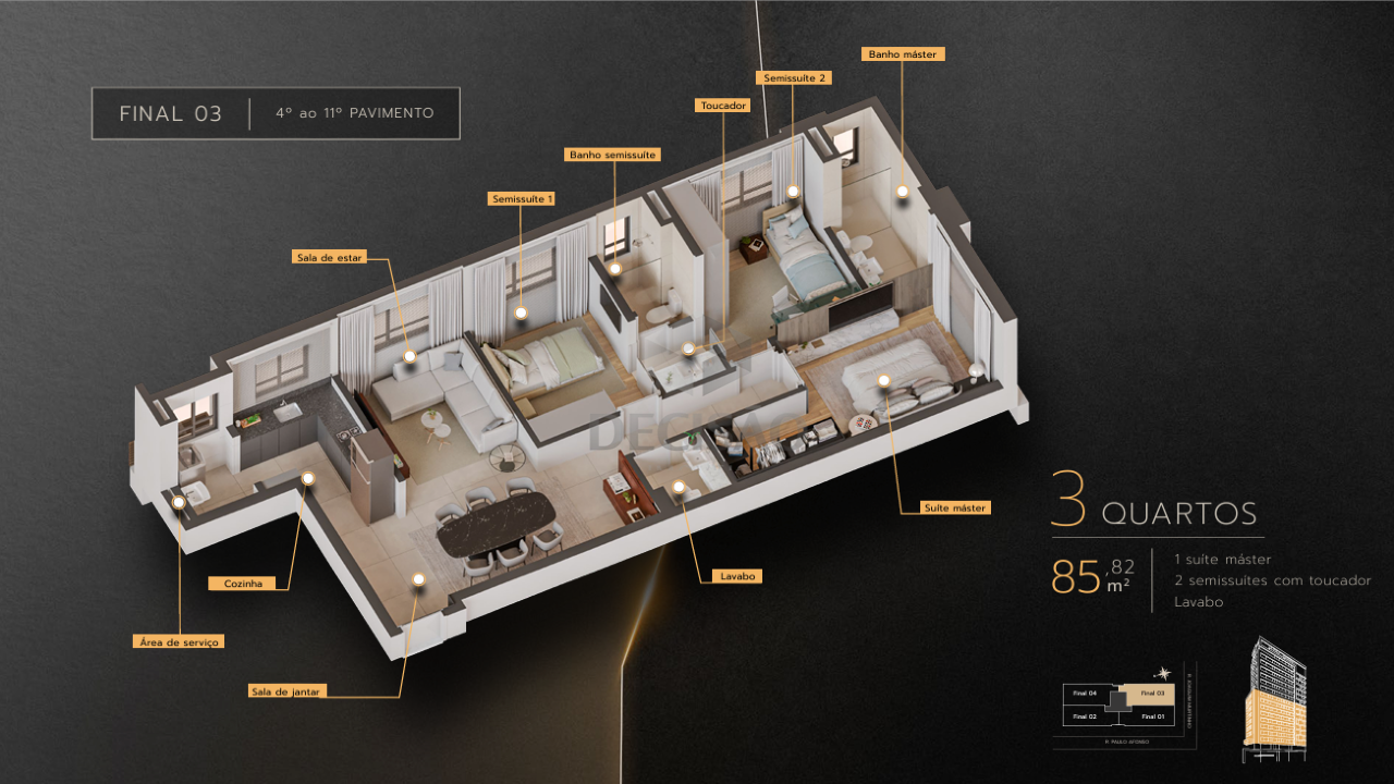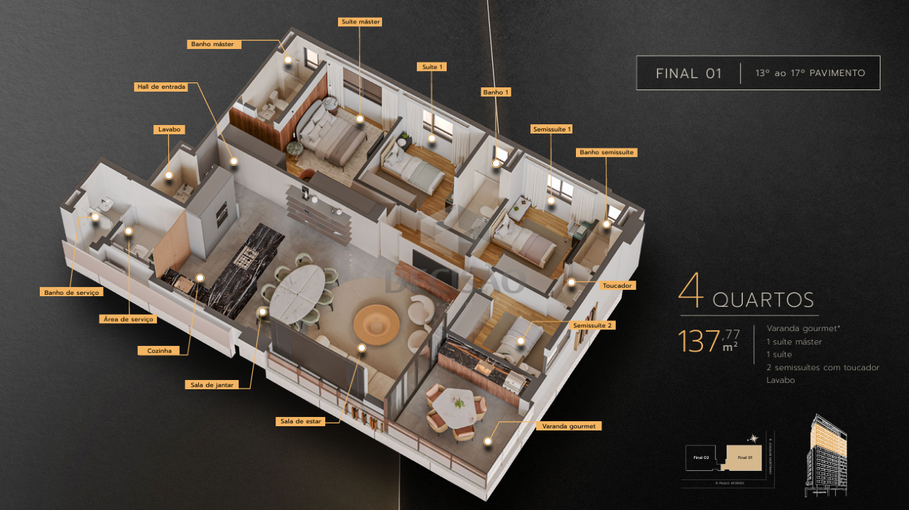 Apto 04 quartos: Sala com varanda e lavabo, 04 quartos, sendo 01 suíte master, 01 suíte junior, 02 semi-suítes, cozinha, área de serviços, banho de serviços.