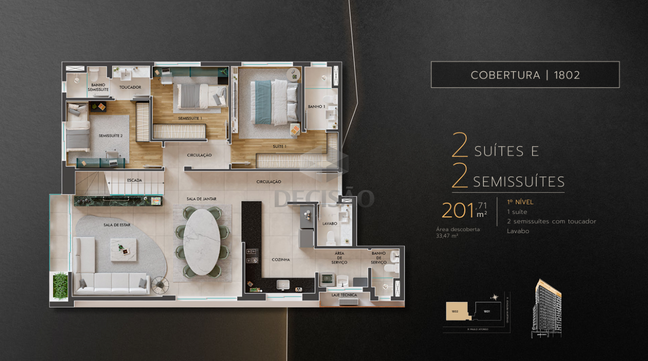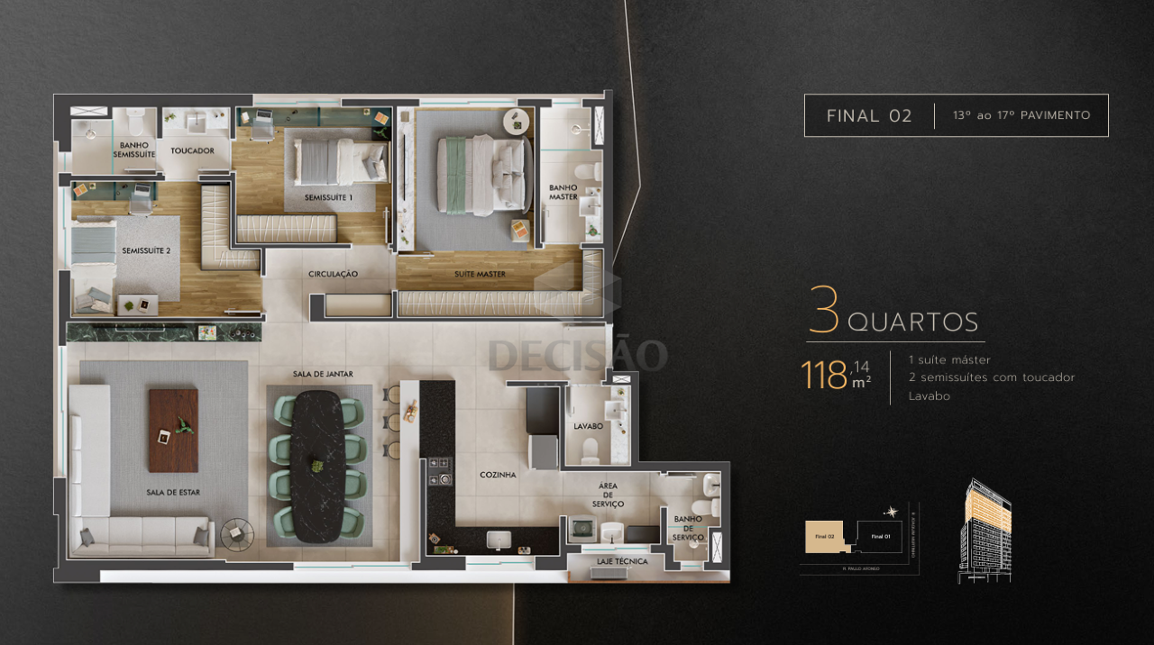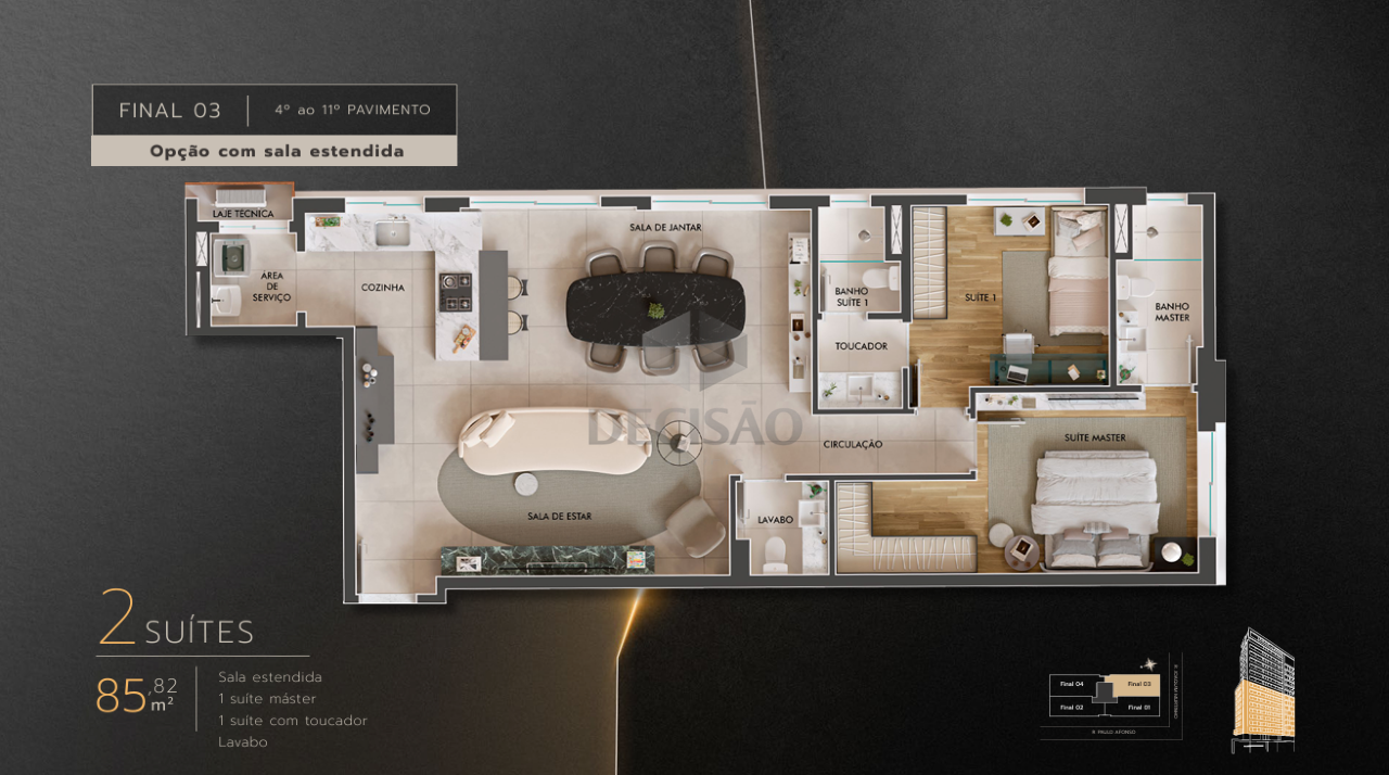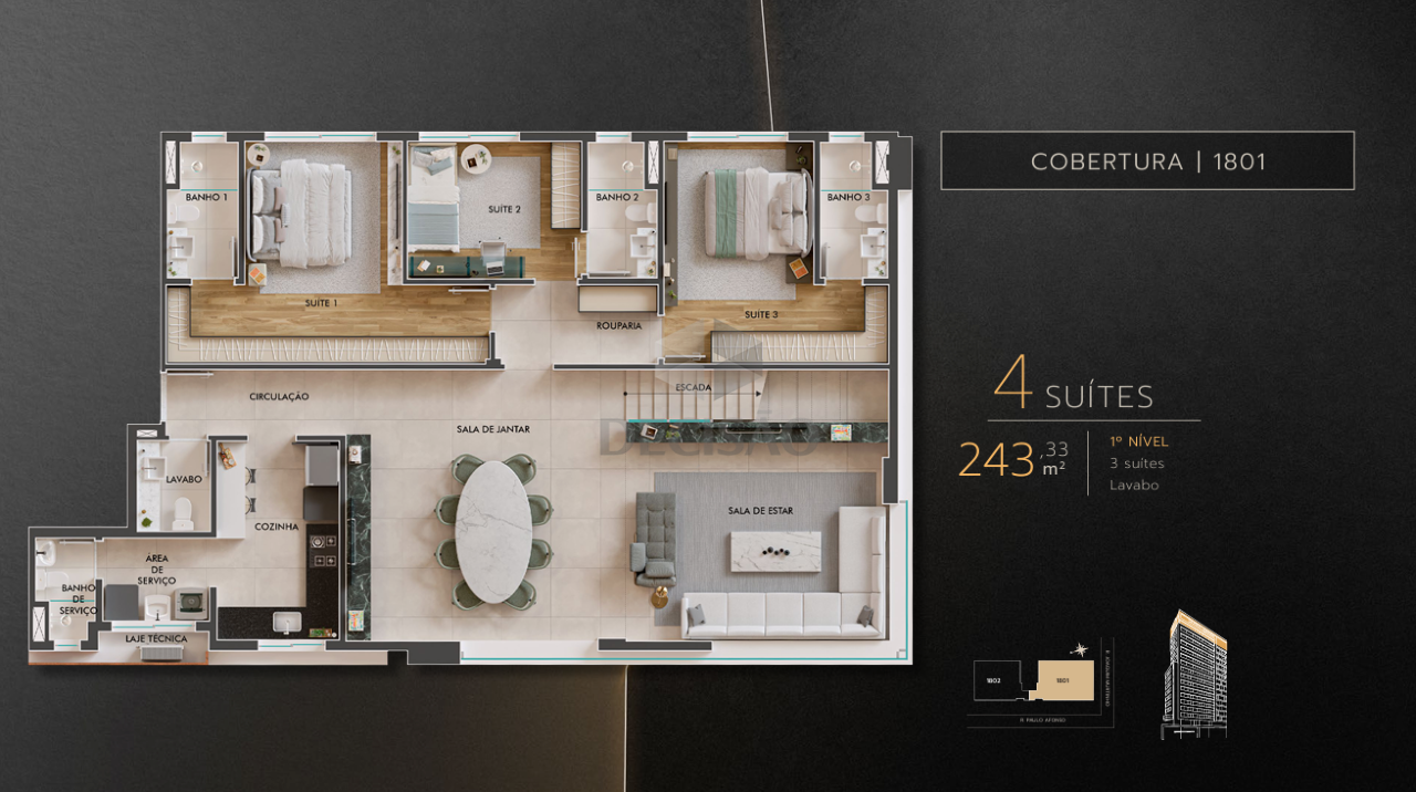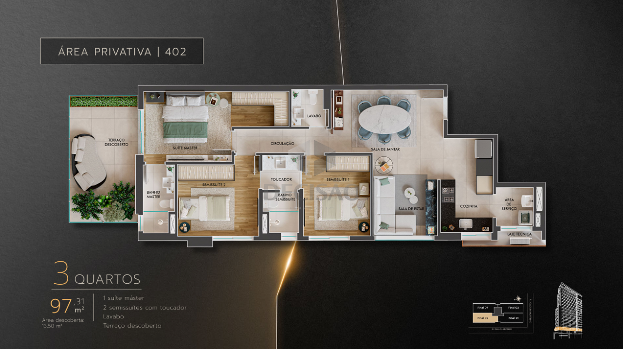 Apto 04 quartos: Sala com varanda e lavabo, 04 quartos, sendo 01 suíte master, 01 suíte junior, 02 semi-suítes, cozinha, área de serviços, banho de serviços.