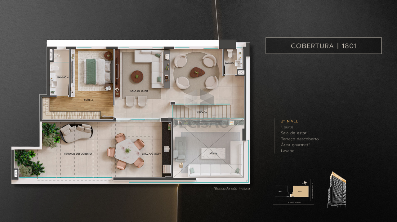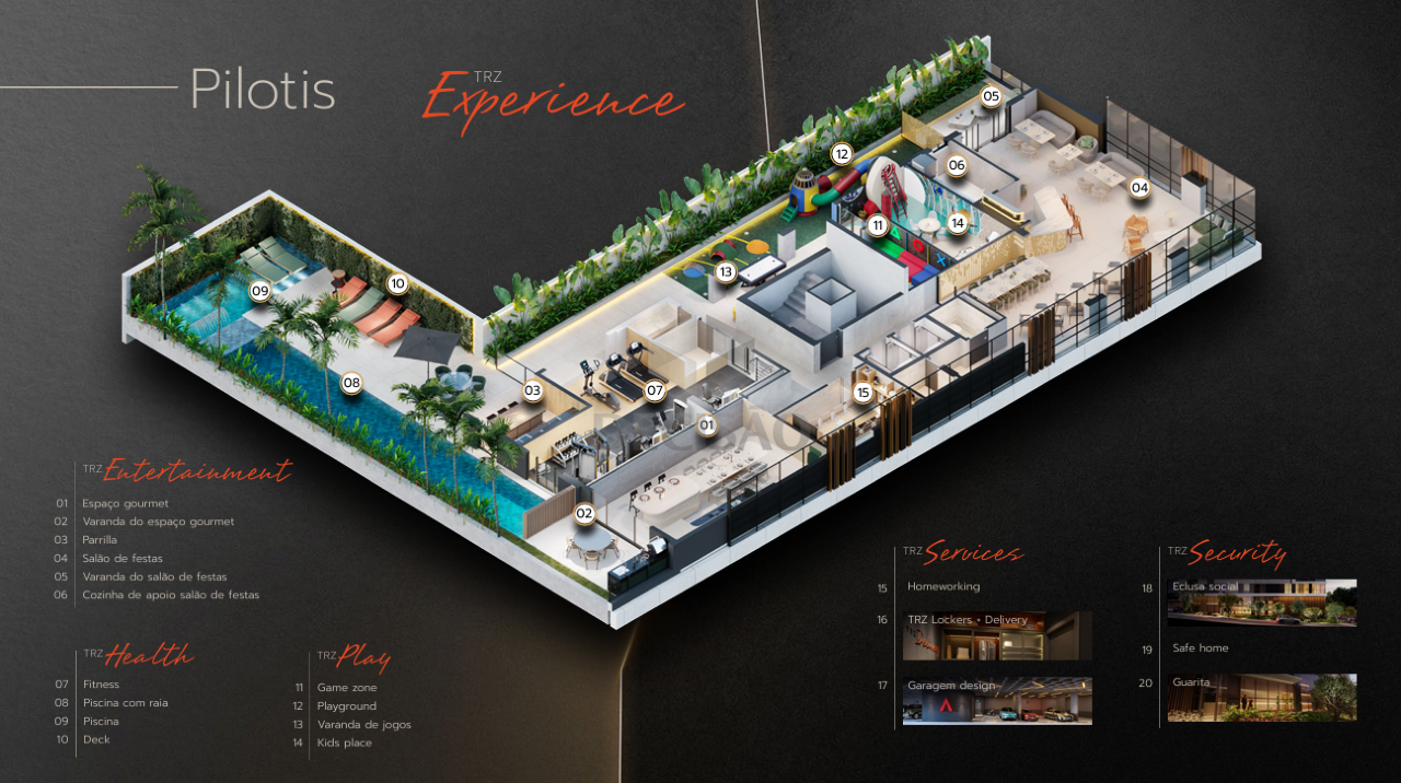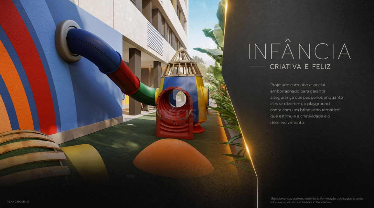 Prédio: Arquitetura imponente, revestido em porcelanato/pele de vidro/textura, recuado, jardins, água individual, gás canalizado, alarme, circuito tv, interfone, jardins, lokers + delivery, hall social, lazer com piscina, piscina com raia, salão de festas, espaço gourmet, parrilha, fitenss, game zone, playground, varanda de jogos, kids place, home workng, recarga para carro elétrico, portão eletrônico, 02 e 03 vagas (vide tabela).