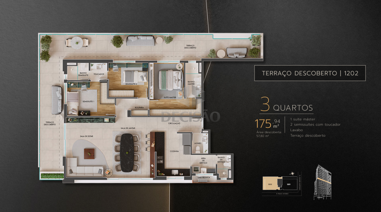 Apto 03 quartos: Sala com varanda e lavabo, 03 quartos, sendo 02 semi-suítes (suíte master), cozinha americana, área de serviços, banho de serviços.