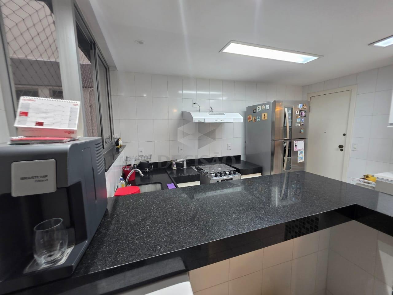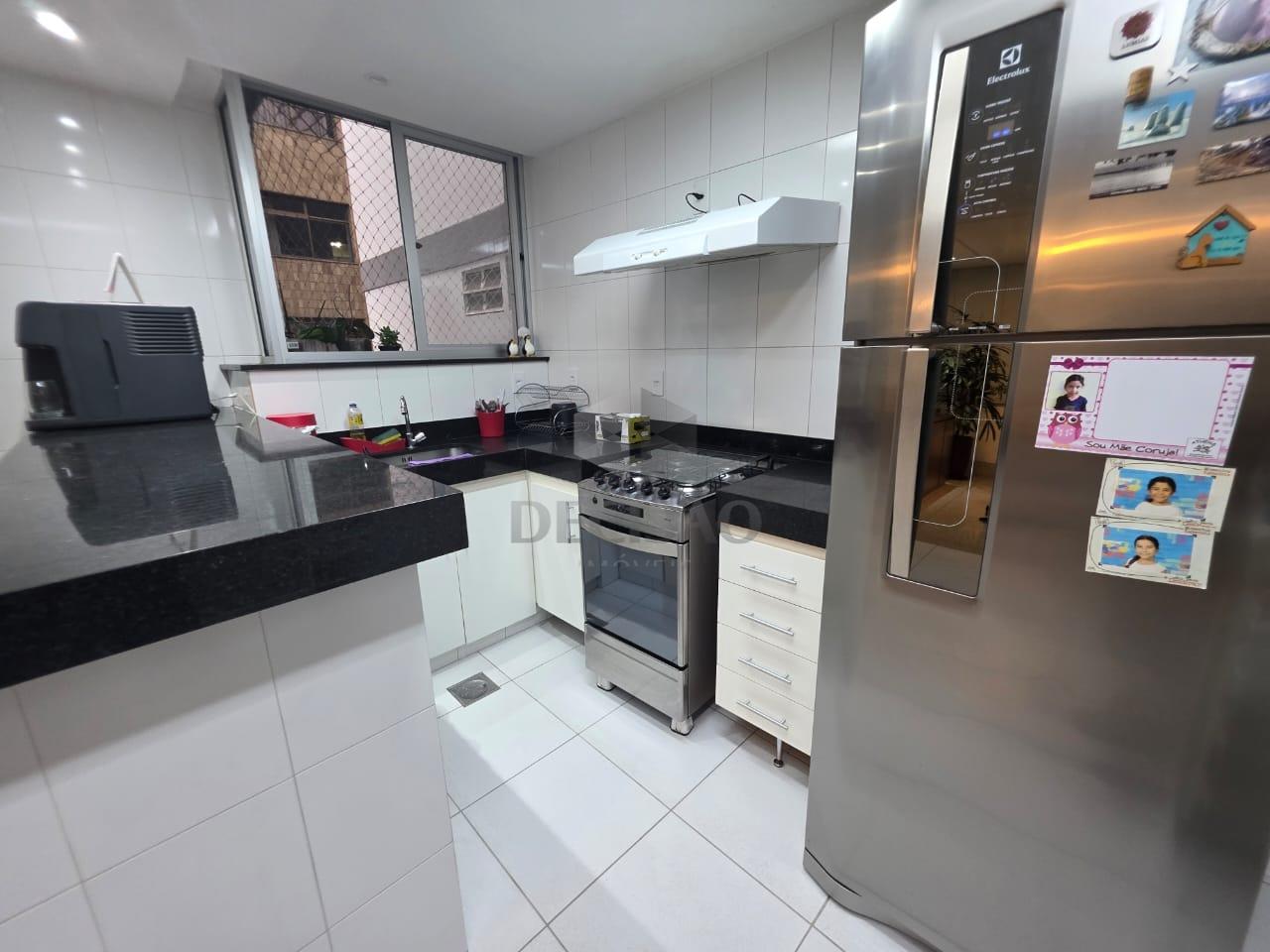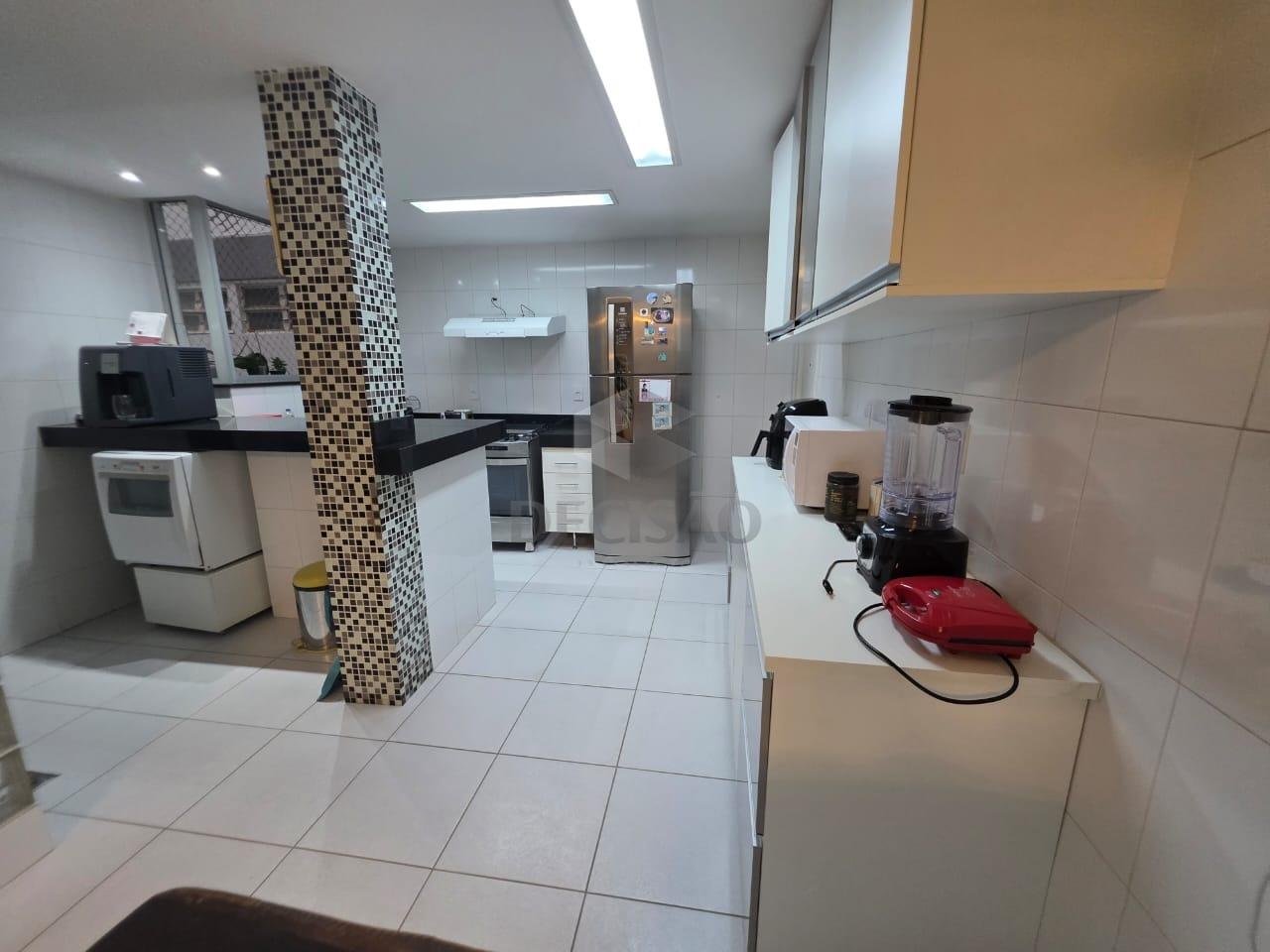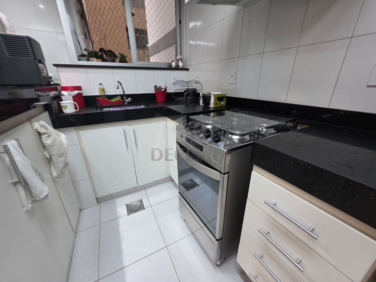 02 sala c/ piso em granito, 03 quartos, c/ piso em laminado marfim, sendo 01 suite e 01 banho social (box / armarios), rouparia, cozinha c/ armários, área de serviço e banho de serviço.