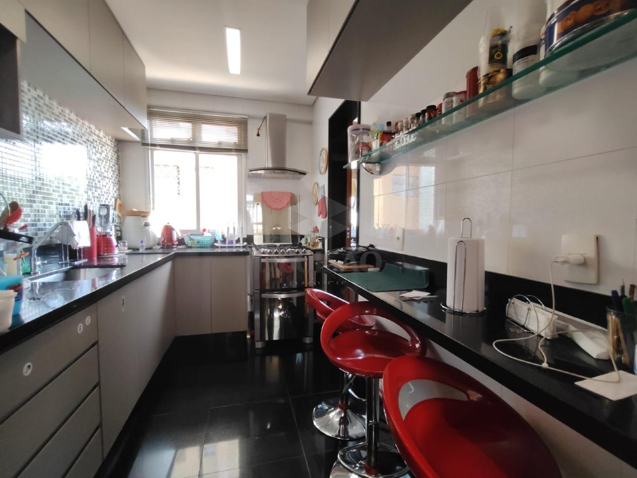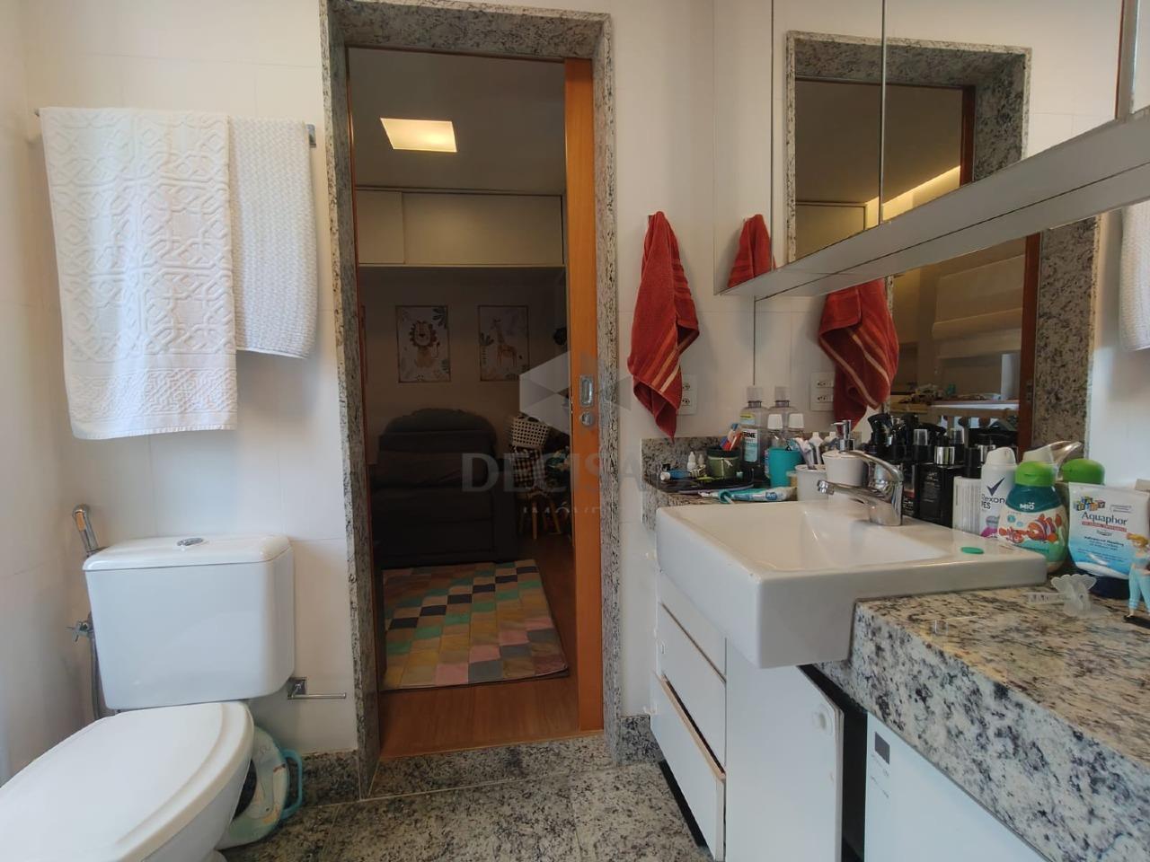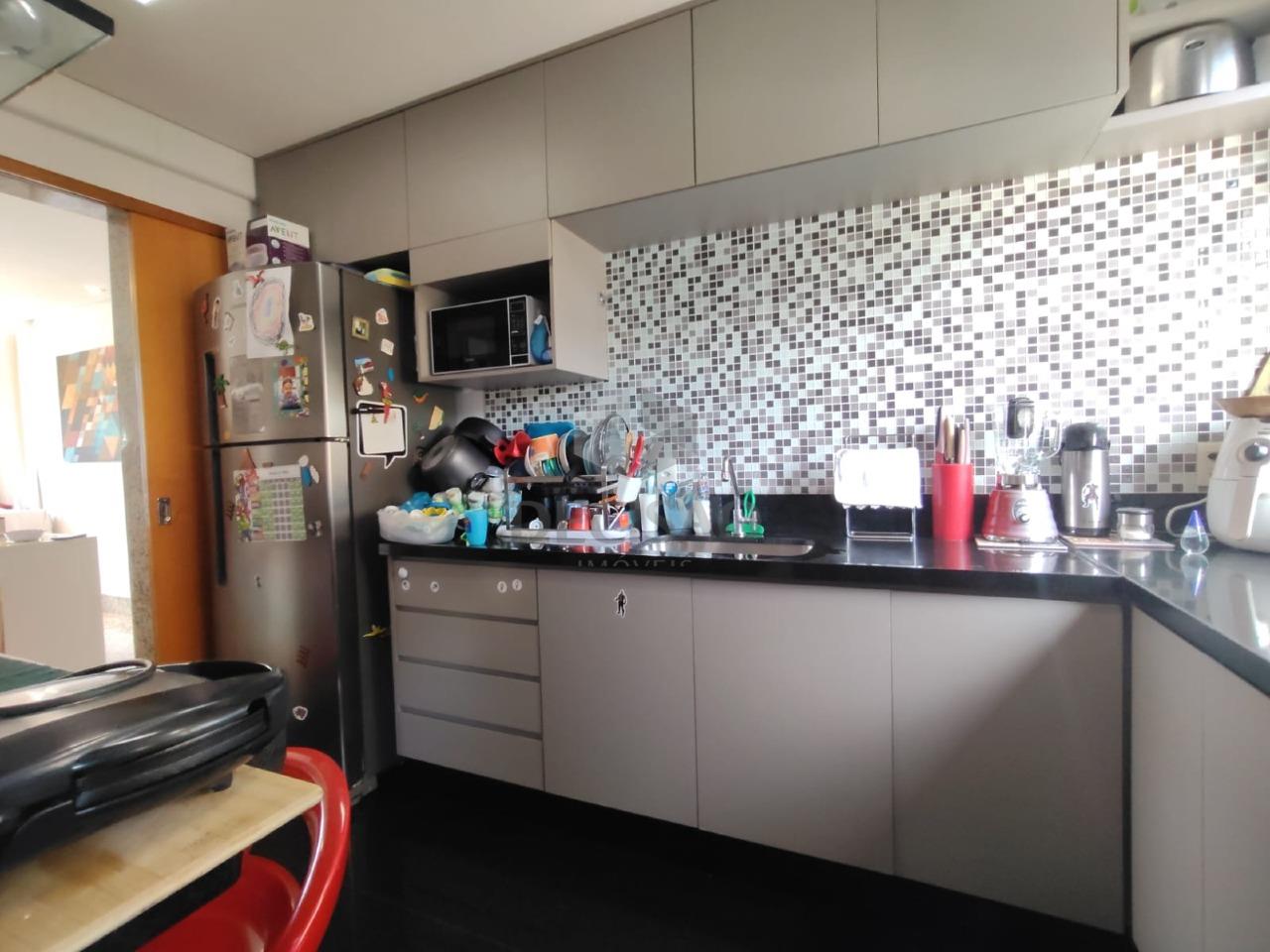 Apto: Salão para 02 ambientes(em granito), lavabo, 03 quartos com armários, sendo 01 suíte e 02 semi-suítes (todas montadas), cozinha com armários, área de serviço, banho de empregada usado como despensa.