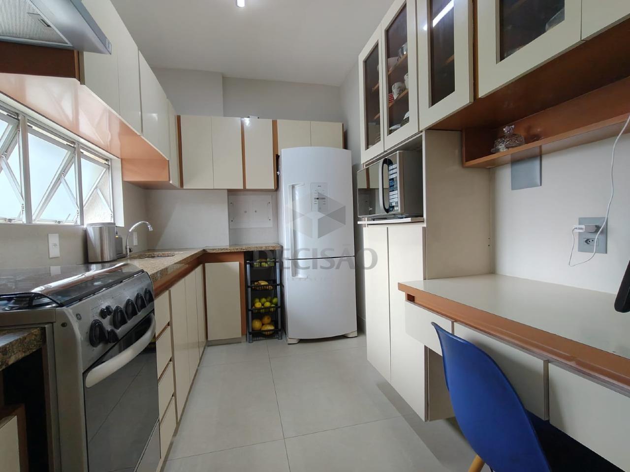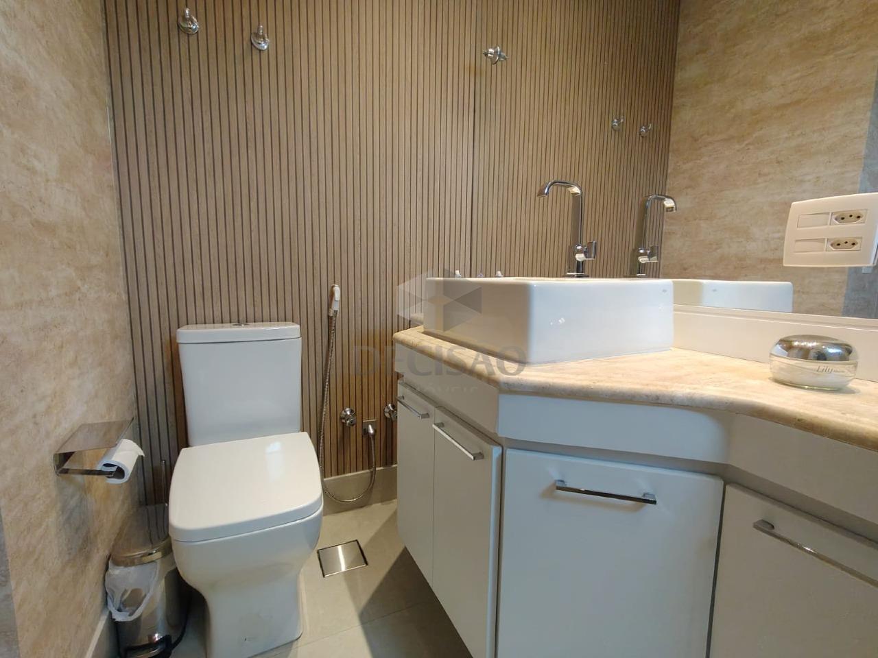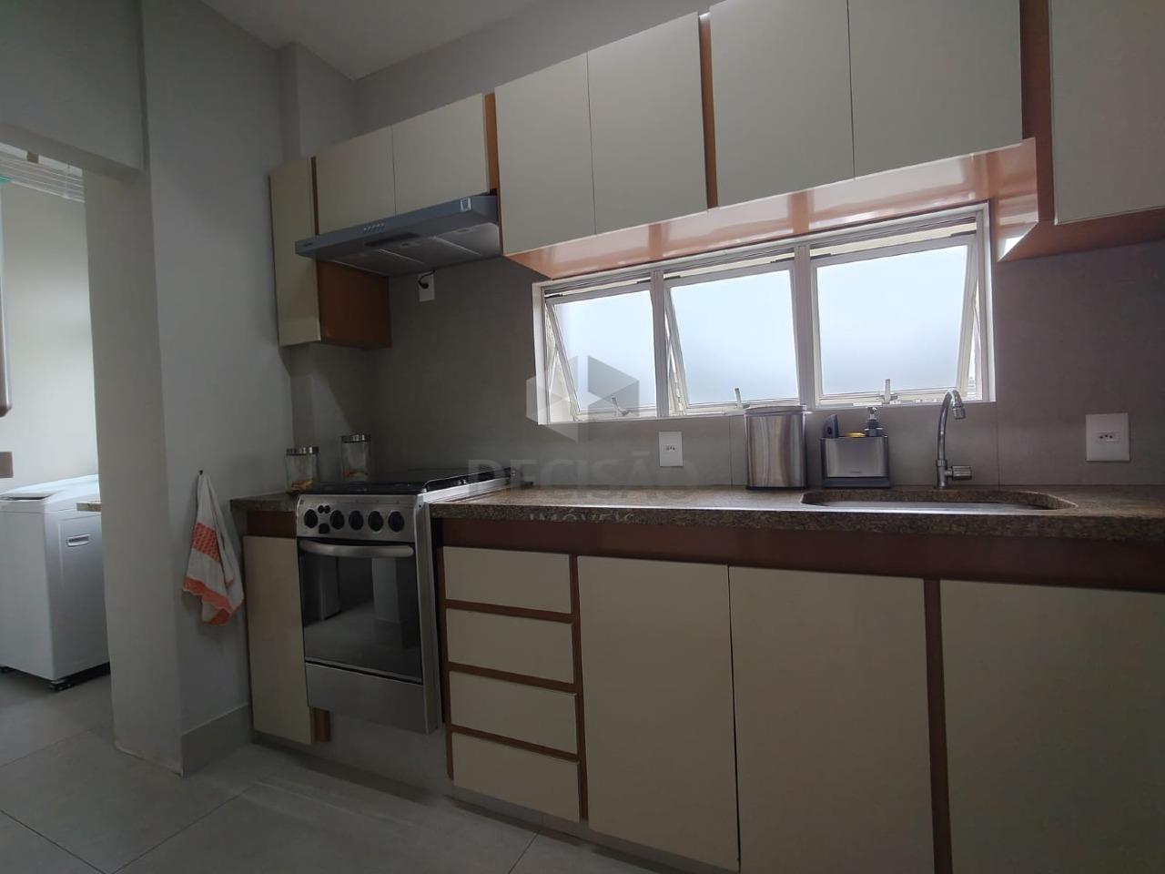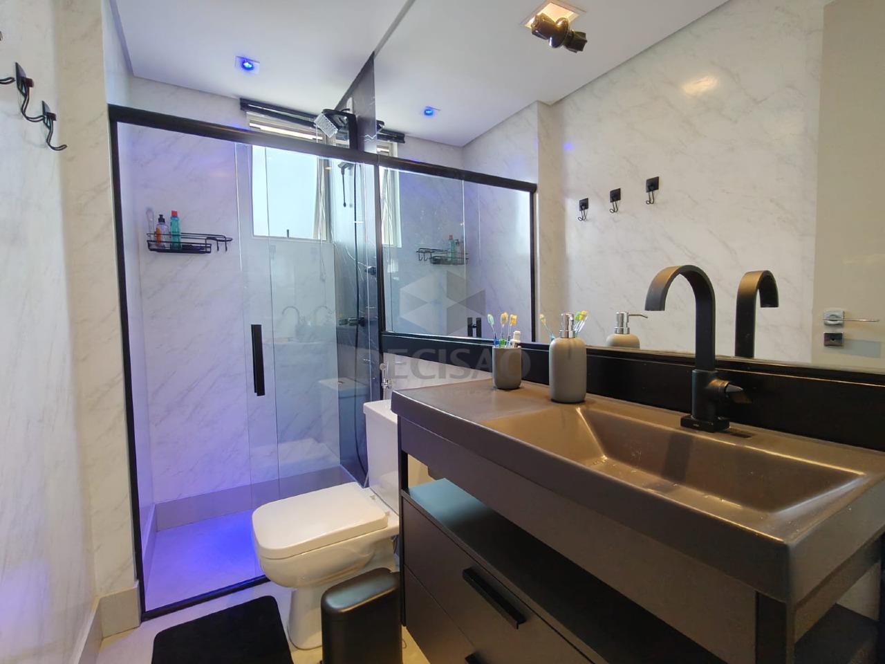 Salão para 02 ambientes (em porcelanato), teto rebaixado e iluminação indireta, 03 quartos com armários, 02 banhos montados, sendo social e suíte, cozinha com armários, área de serviços, dce.