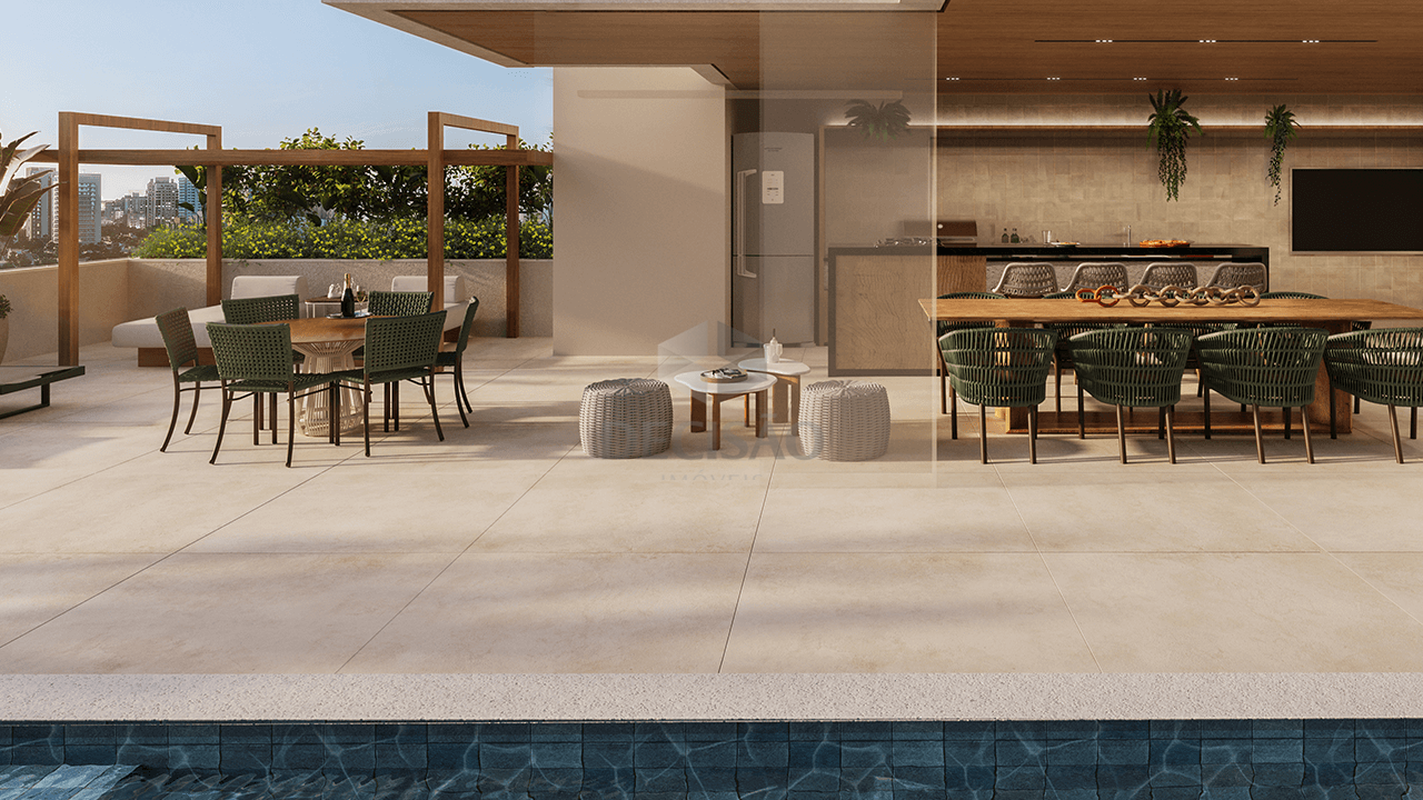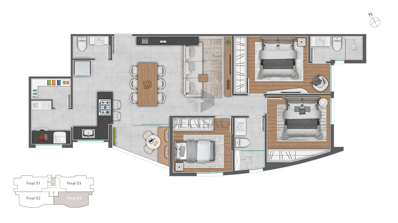 Apto: Salão para 02 ambientes, lavabo, varanda, 03 quartos, sendo 01 suíte e banho social, cozinha aberta, área de serviços e despensa.