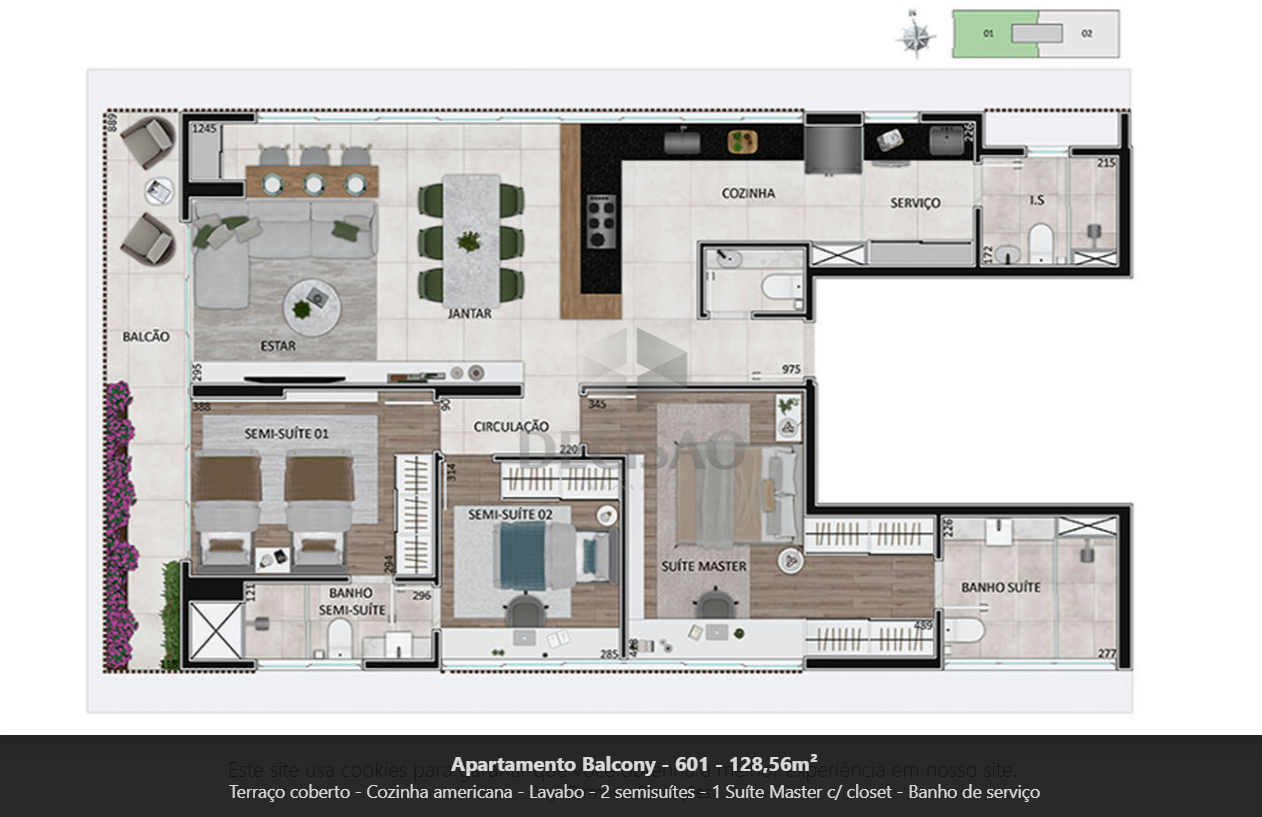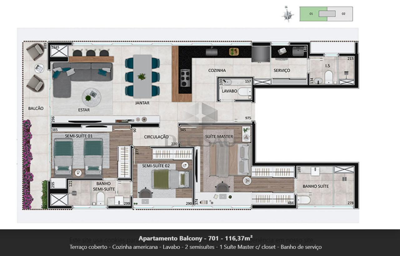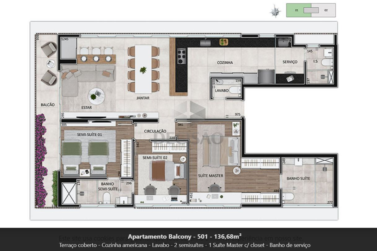 Apto 03 quartos: Sala para 02 ambientes, varanda, 03 quartos, sendo 01 suíte com closet e 02 semi-suítes, banhos (com bancadas),, cozinha americana com bancadas de granito, área de serviços.