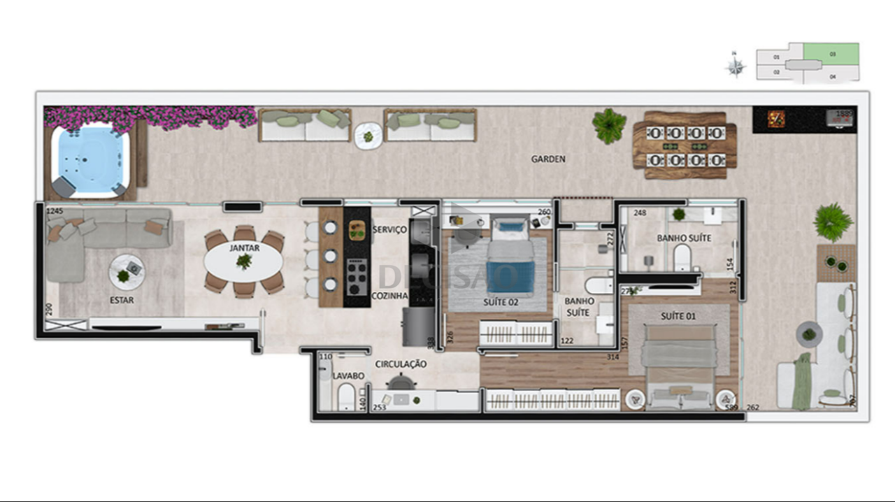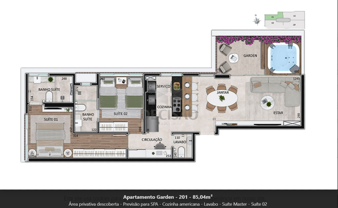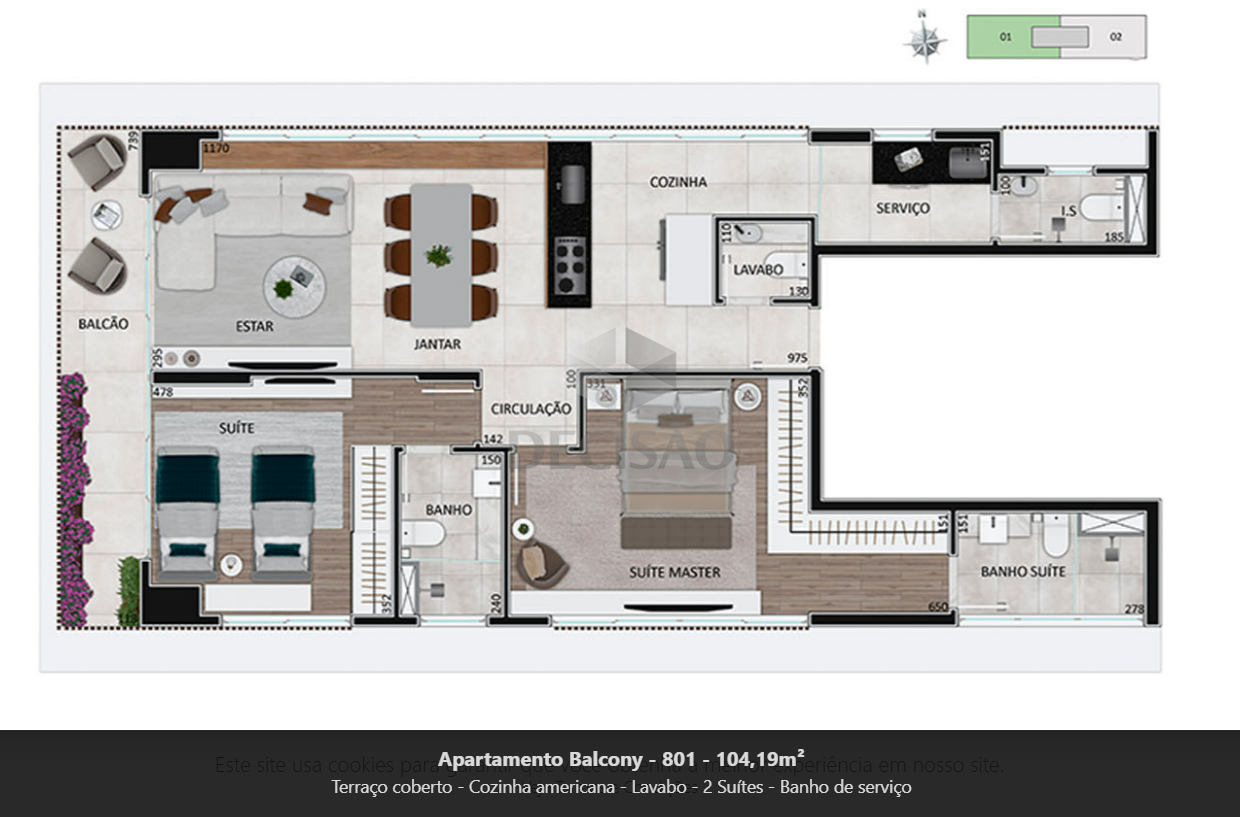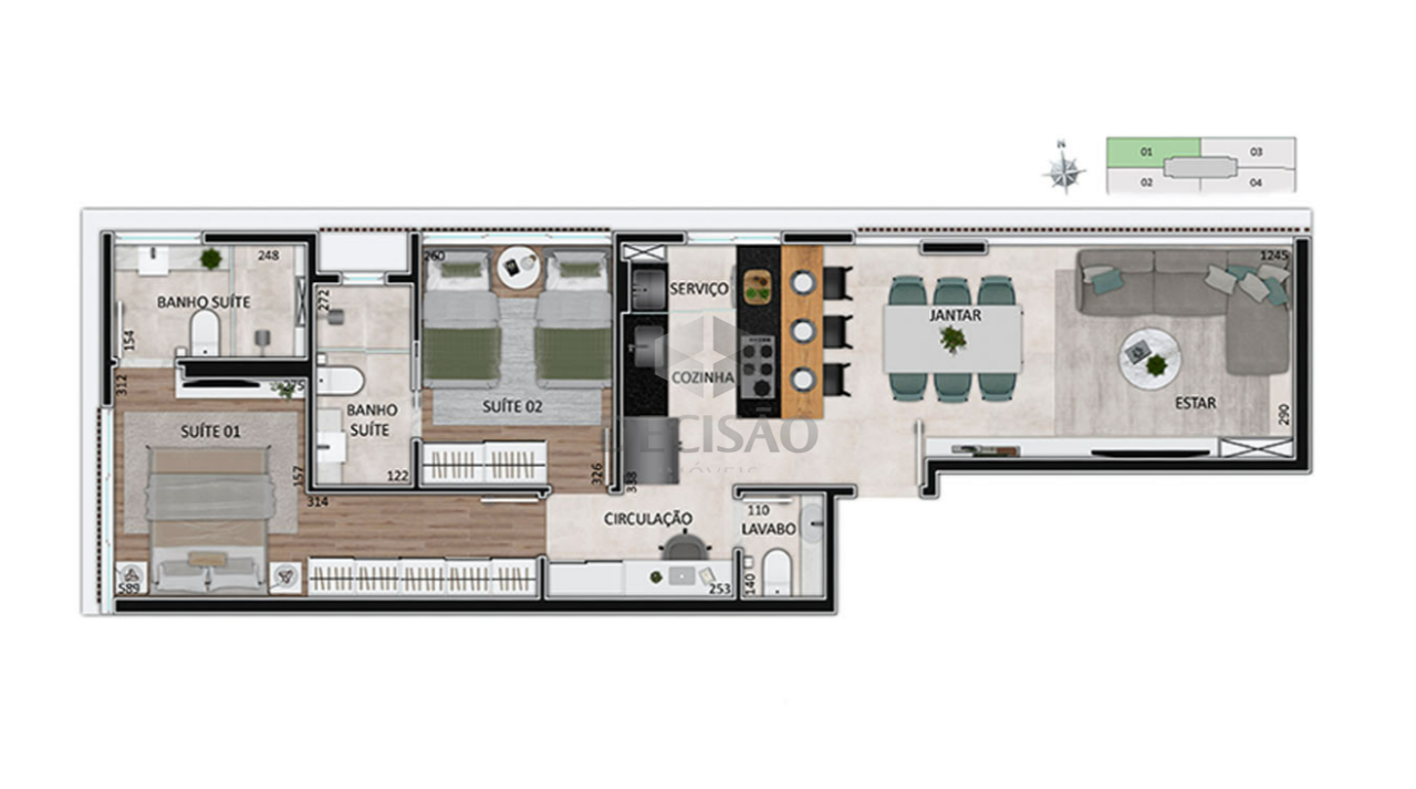 Apto 03 quartos: Sala para 02 ambientes, varanda, 03 quartos, sendo 01 suíte com closet e 02 semi-suítes, banhos (com bancadas),, cozinha americana com bancadas de granito, área de serviços.