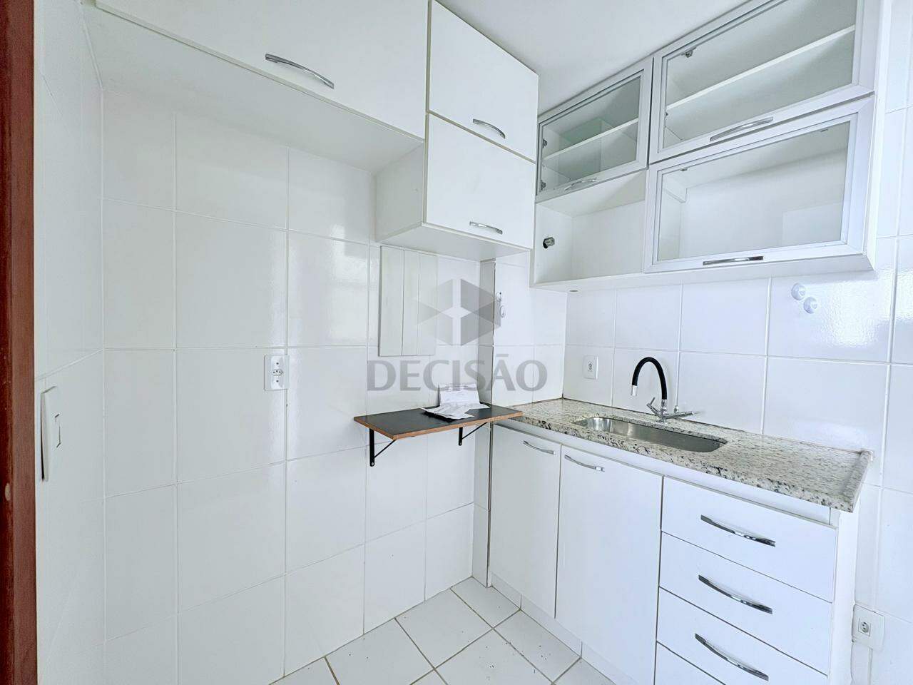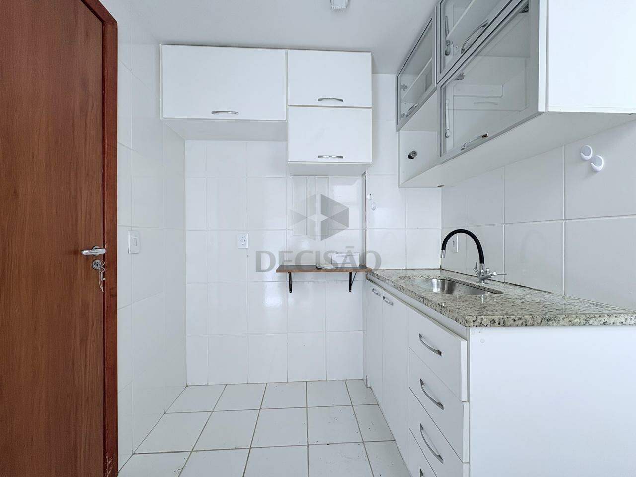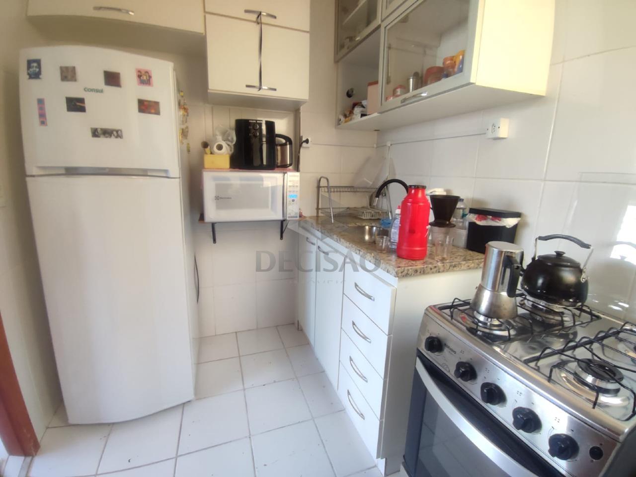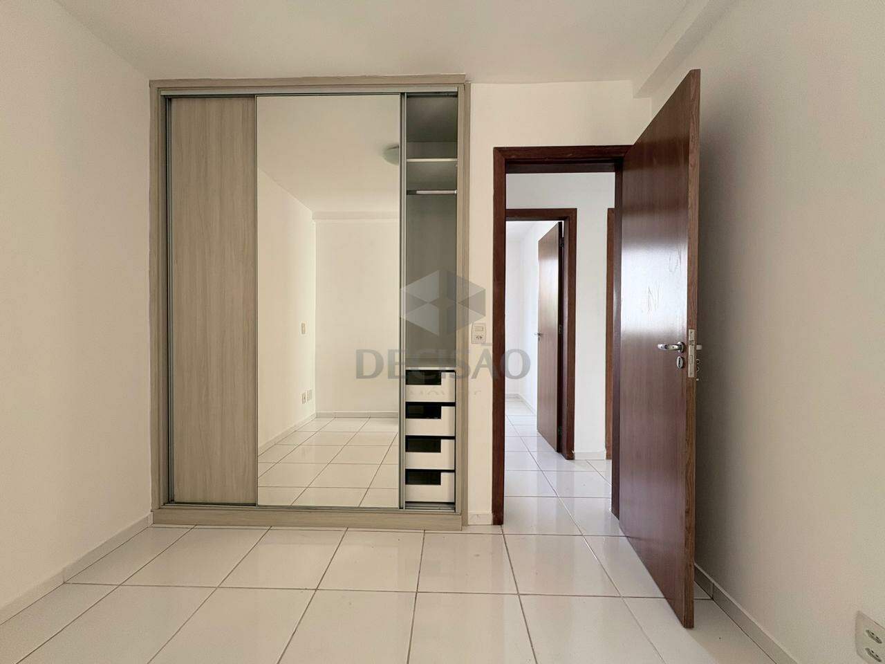 Sala para 02 ambientes (piso em porcelanato), com vista, 03 quartos com armários, sendo 01 suíte, banho social (com box, armários e espelho), cozinha com armários e área de serviços.