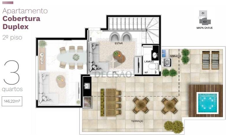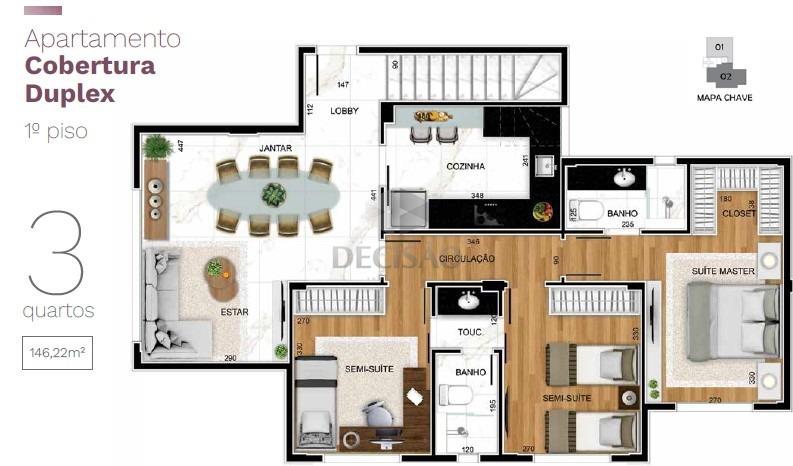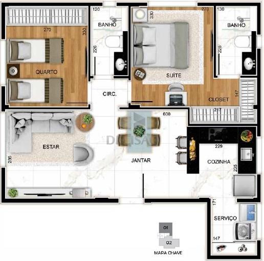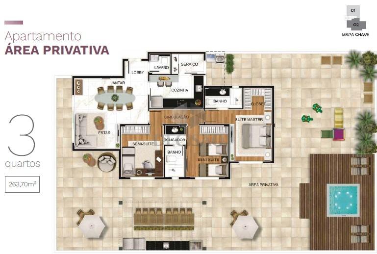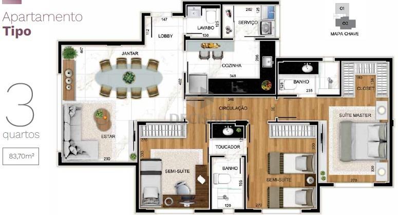 Apto 03 quartos: Com 83,70m² - Sala para 02 ambientes, com lavabo, 03 quartos, 02 suítes (suíte master com closet), cozinha, área de serviços.