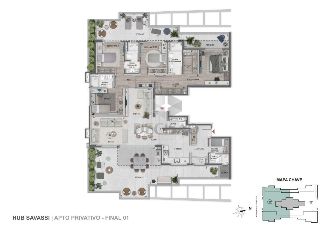 Apto: Ampla sala para vários ambientes, lavabo, varanda, 03 quartos, sendo 02 suítes (suíte master com closet), 02 semi-suítes, cozinha ampla, área de serviços e banho de funcionários.
