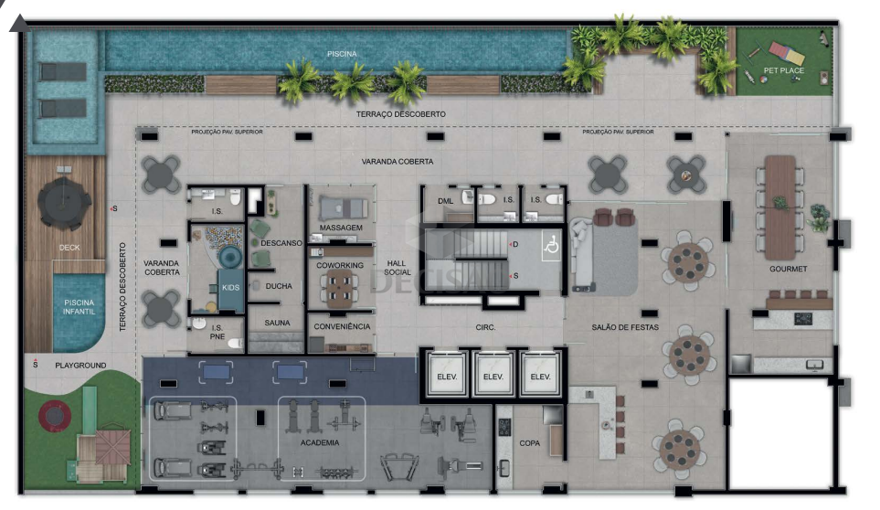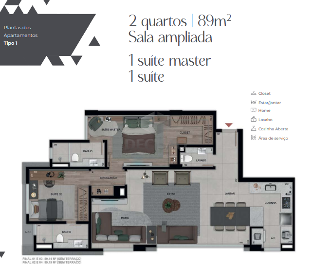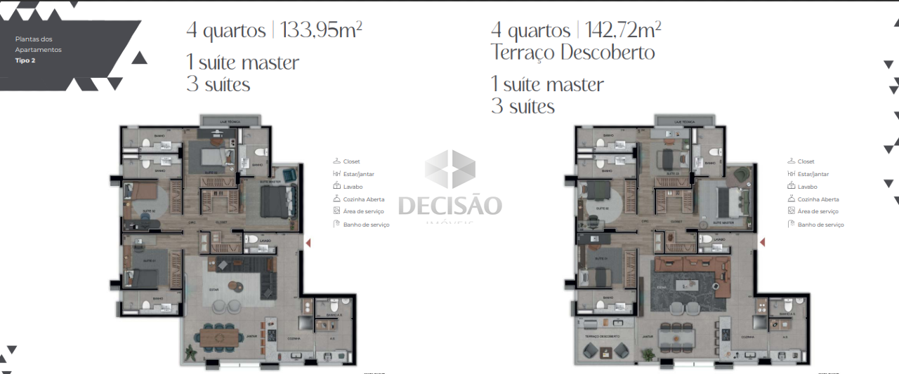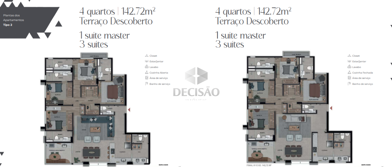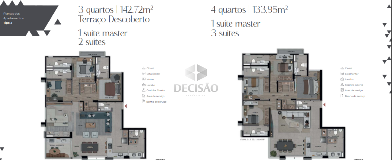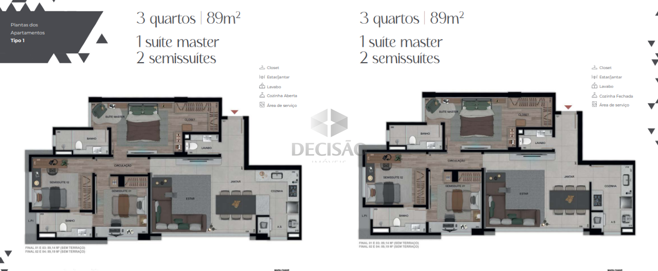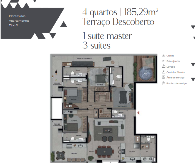 Apto 03 quartos: Sala ampla com e sem varanda, lavabo, 02 suítes e 01 semi-suítes, closet, cozinha americana, área de serviços.