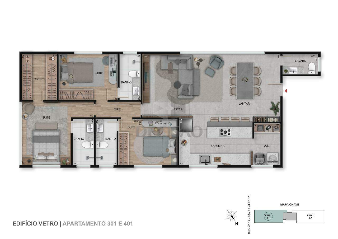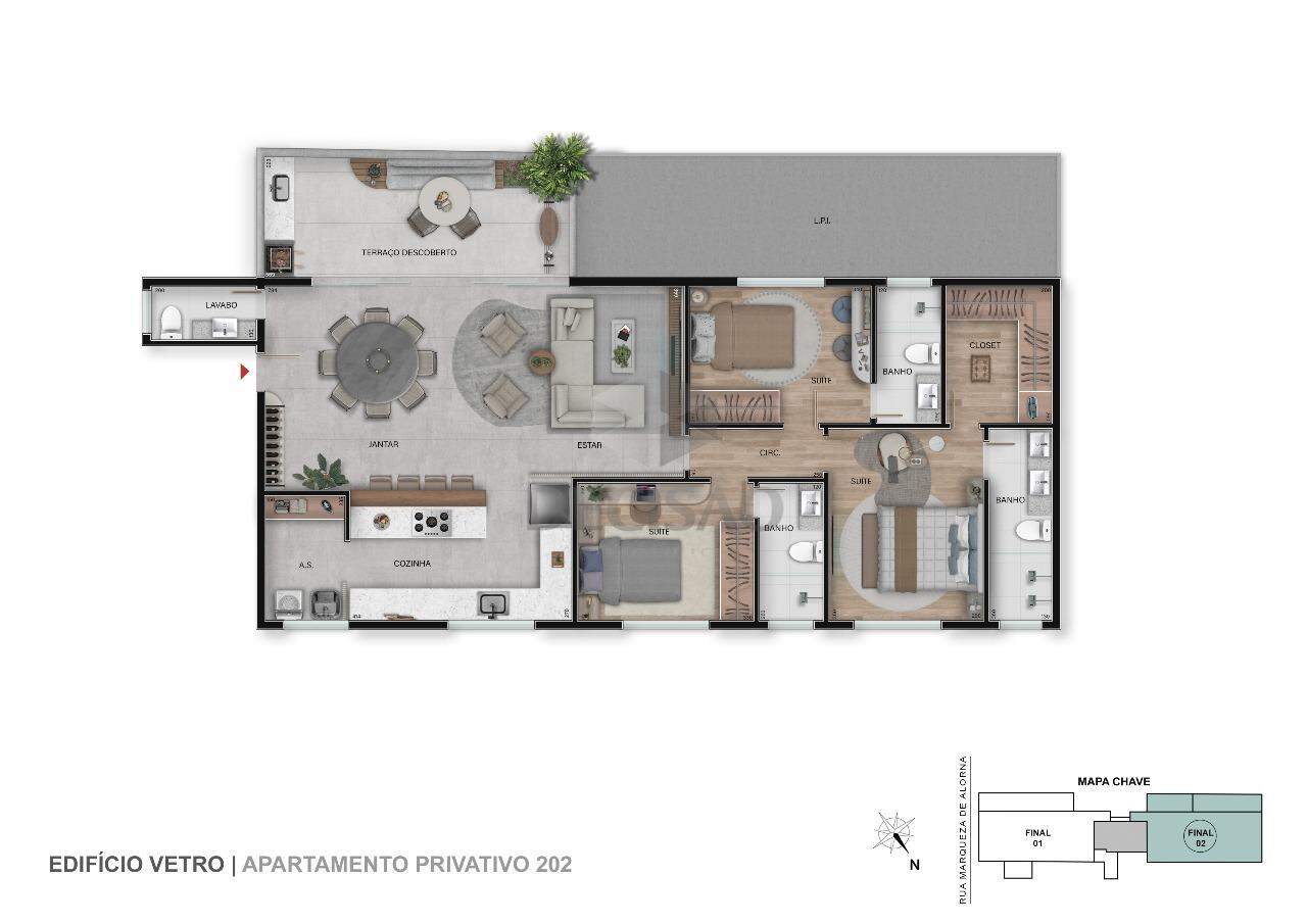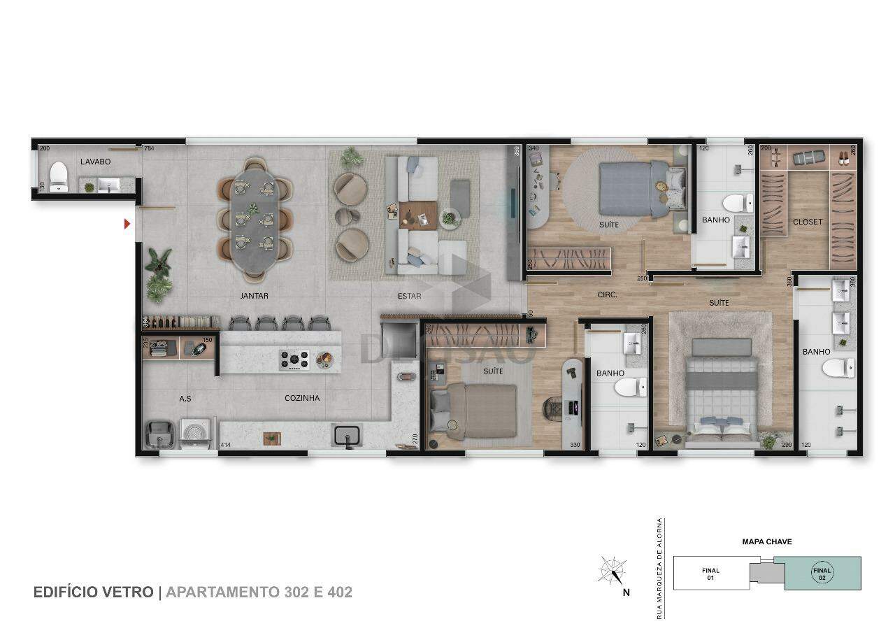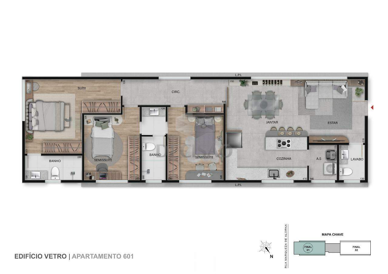 Apto: Salão para 02 ambientes, lavabo, 03 quartos, sendo 03 suítes, closet, cozinha no conceito aberto, área de serviços.