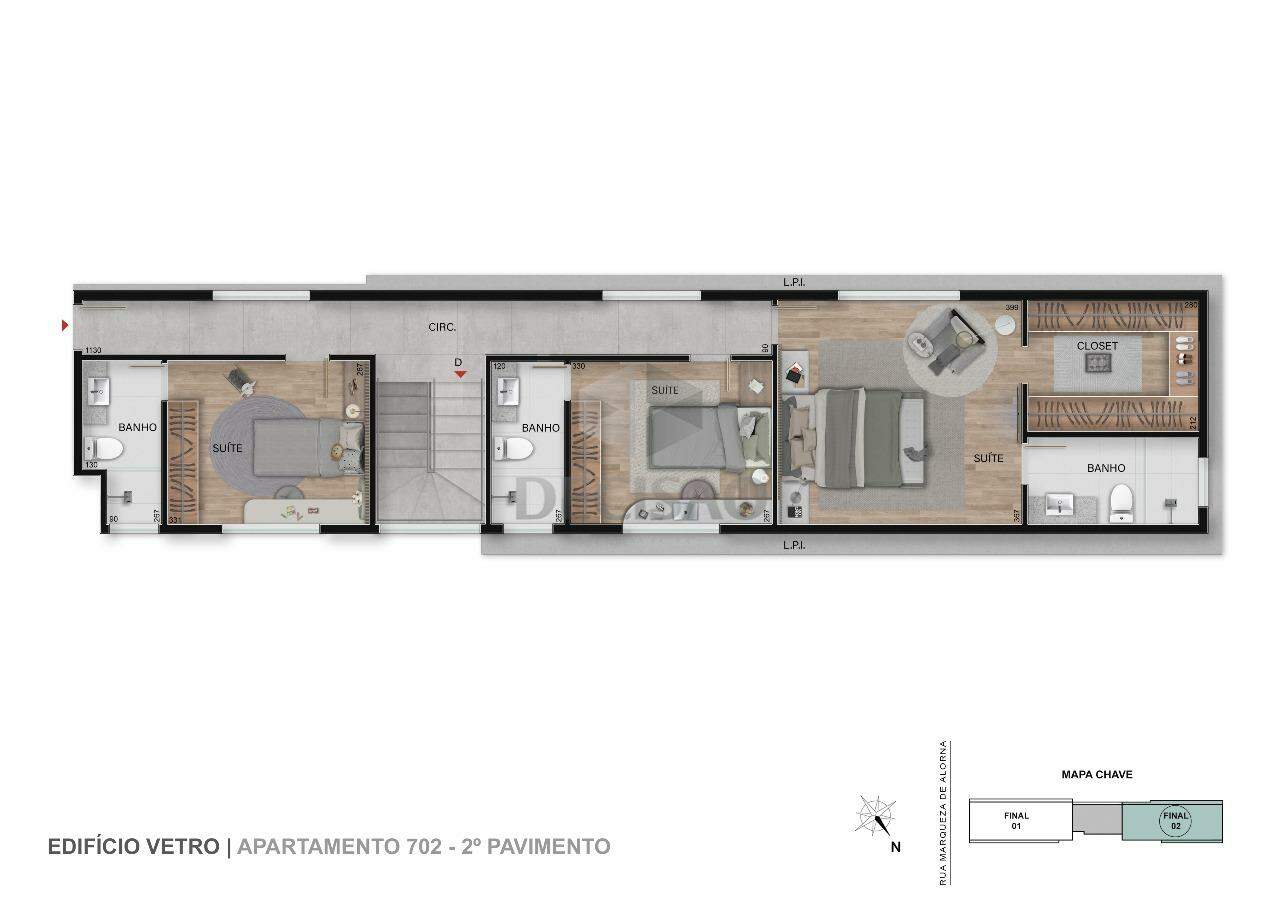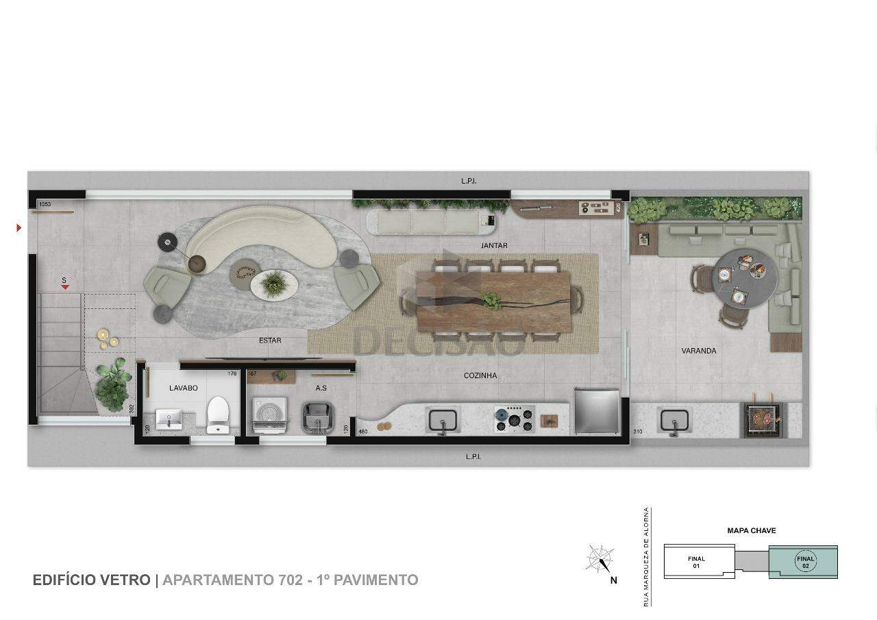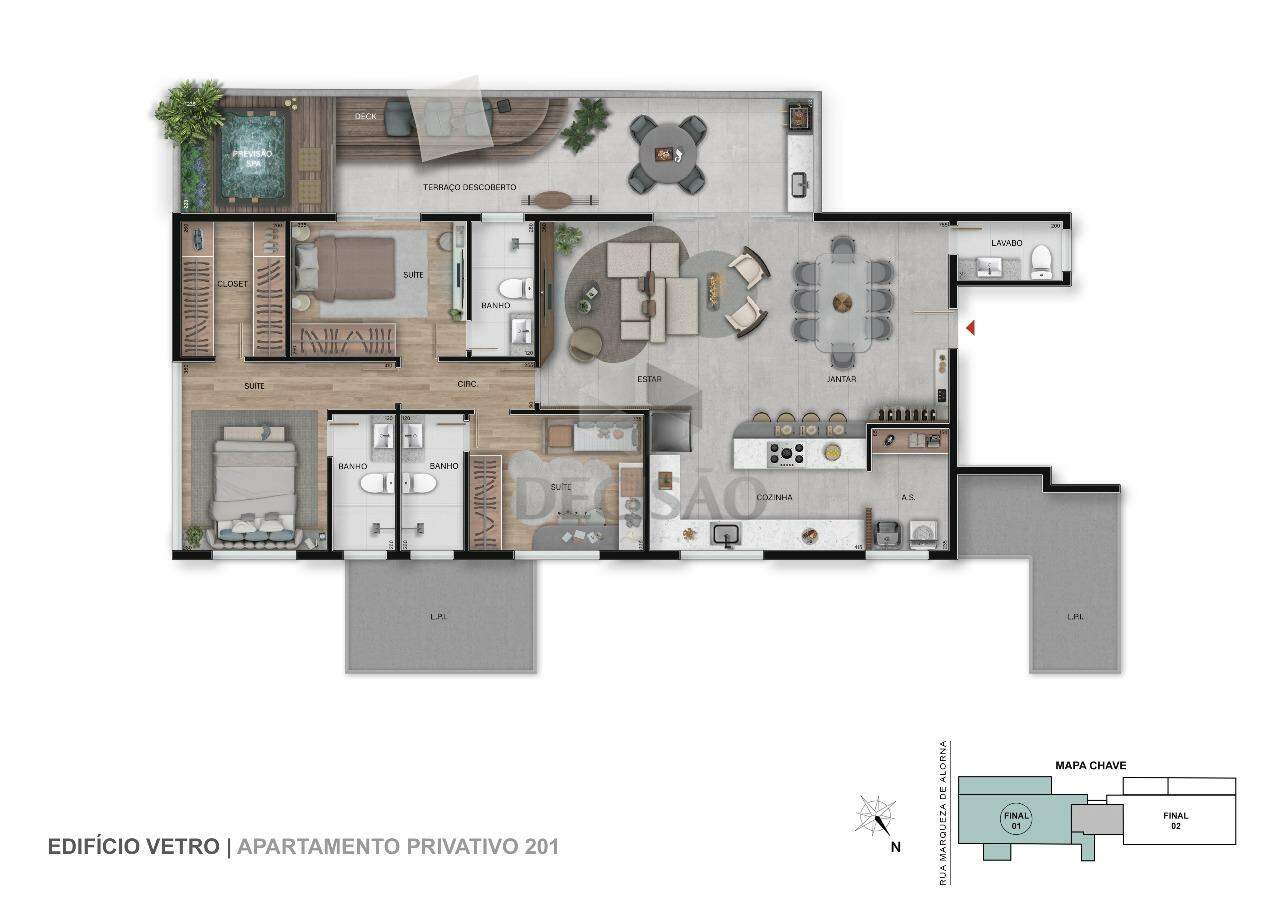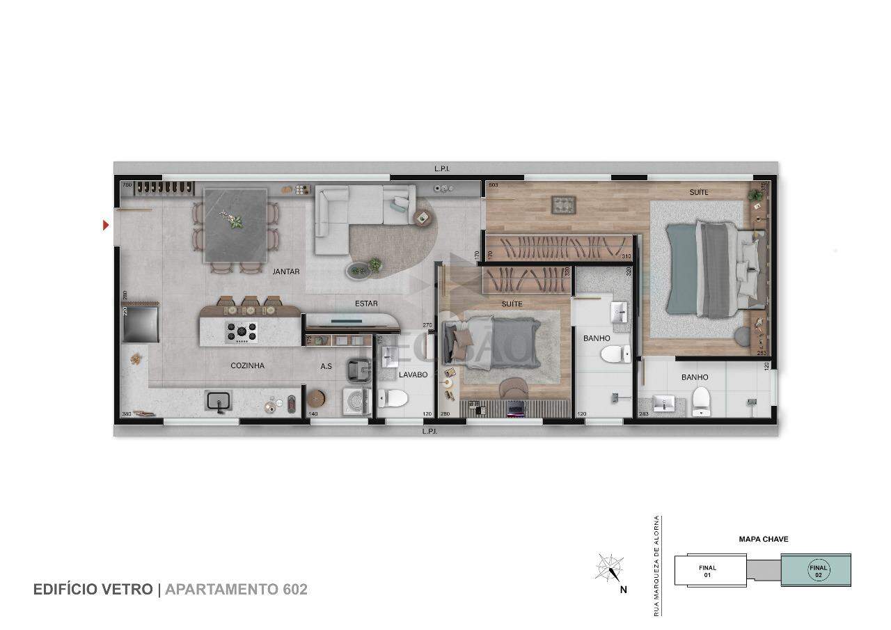 Apto: Salão para 02 ambientes, lavabo, 03 quartos, sendo 03 suítes, closet, cozinha no conceito aberto, área de serviços.