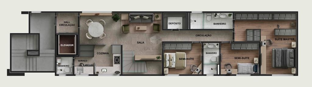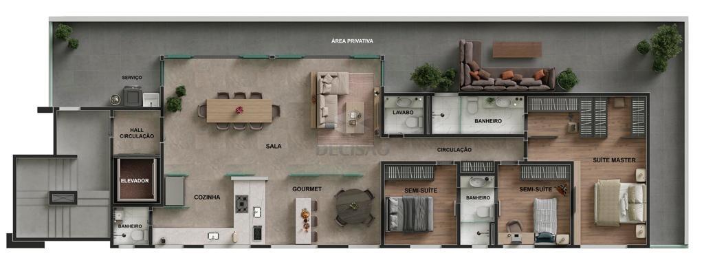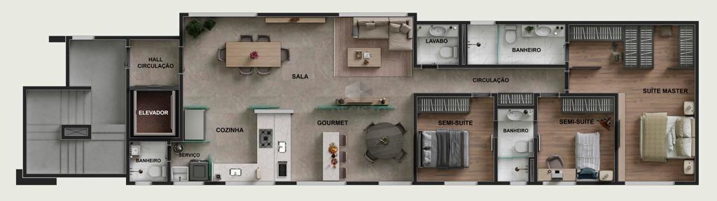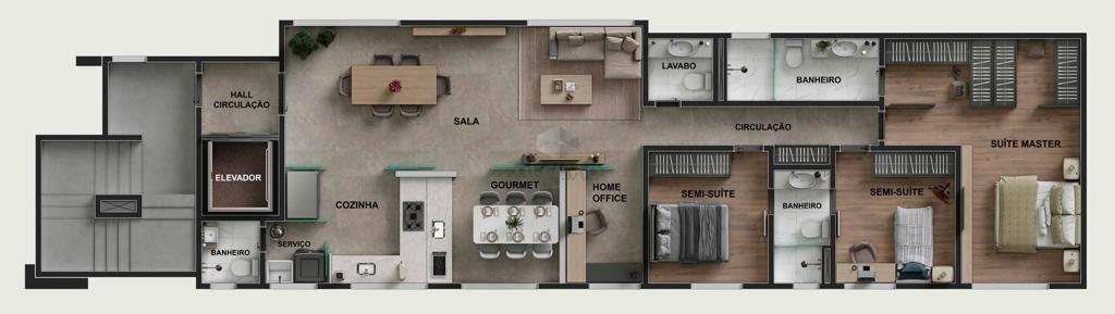 Apto: As unidades contam com plantas muito bem distribuídas com suíte master com closet, 02 semi-suítes, rouparia, lavabo, sala para 03 ambientes (com possibilidade de plantas flexíveis incluindo gourmet, home office, mais um quarto ou sala ampliada), cozinha, lavanderia e banho de serviços.