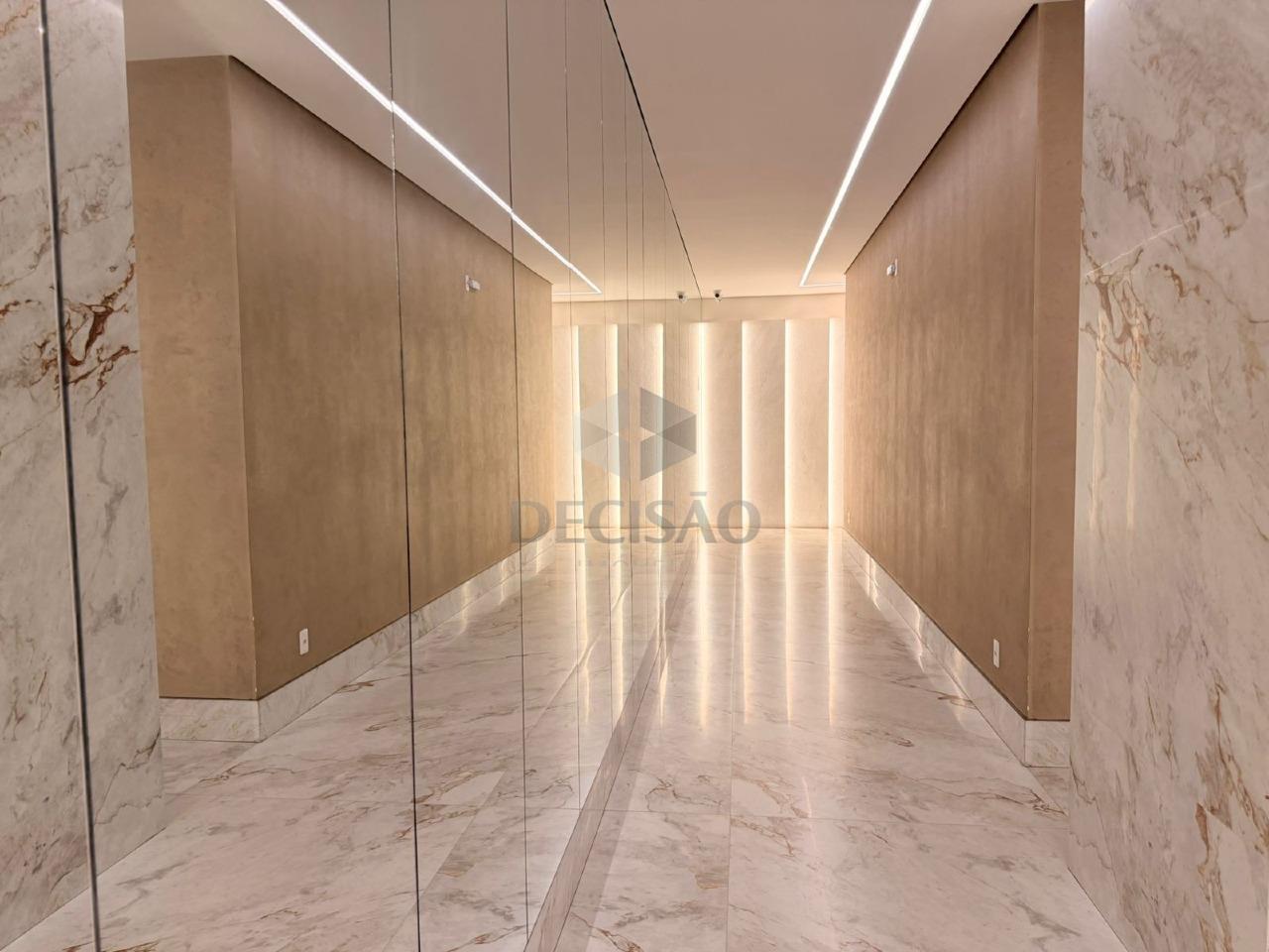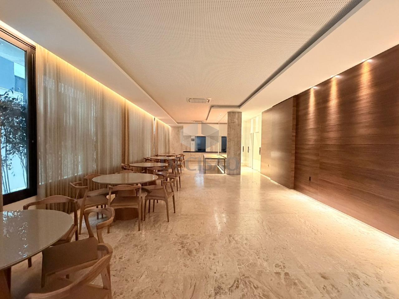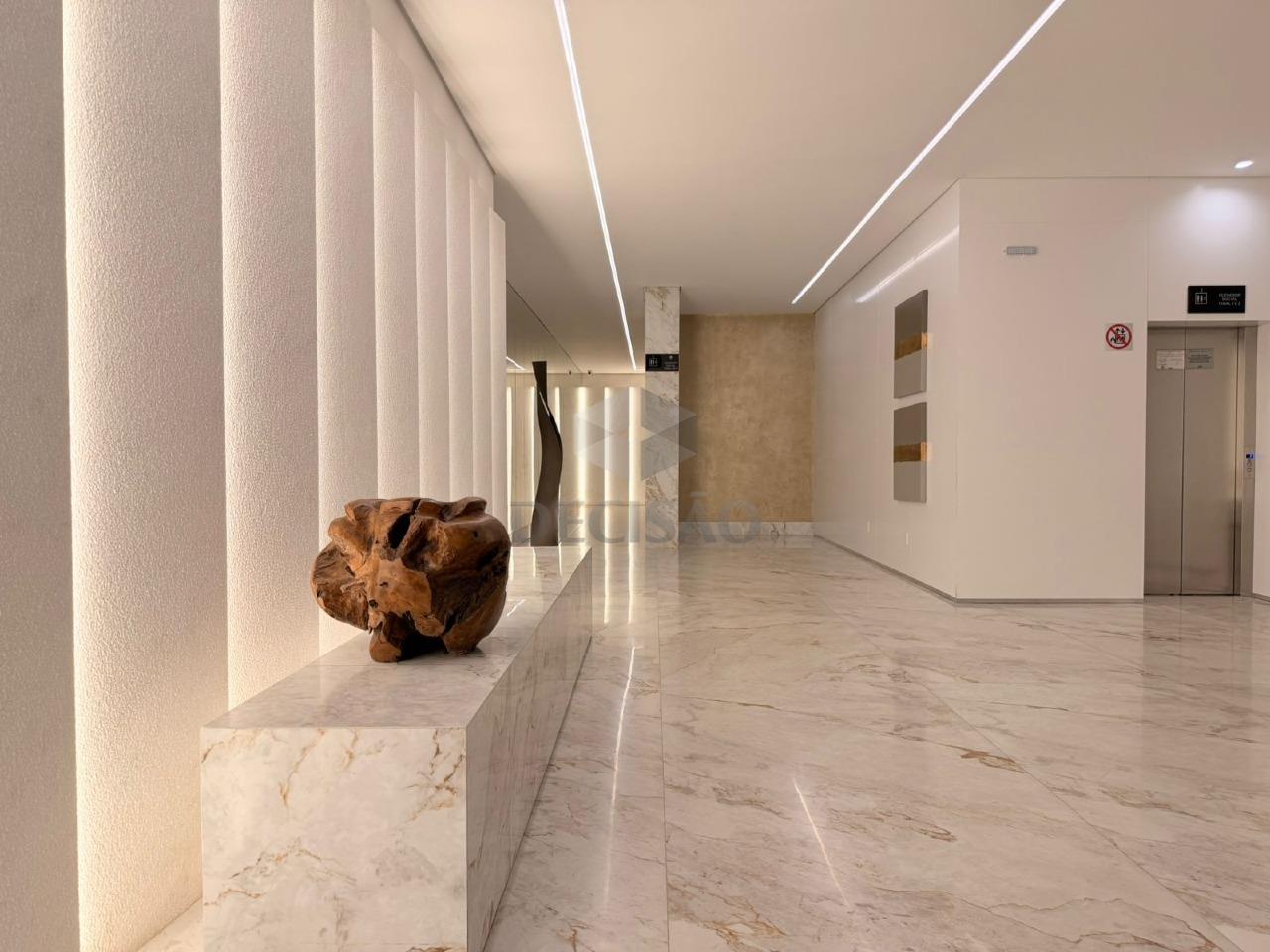 A sala é ampla e integrada à varanda, com acabamento sofisticado. Sala, varanda e banheiros possuem revestimento em mármore paginado, proporcionando elegância e requinte.