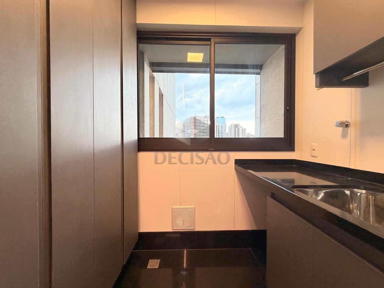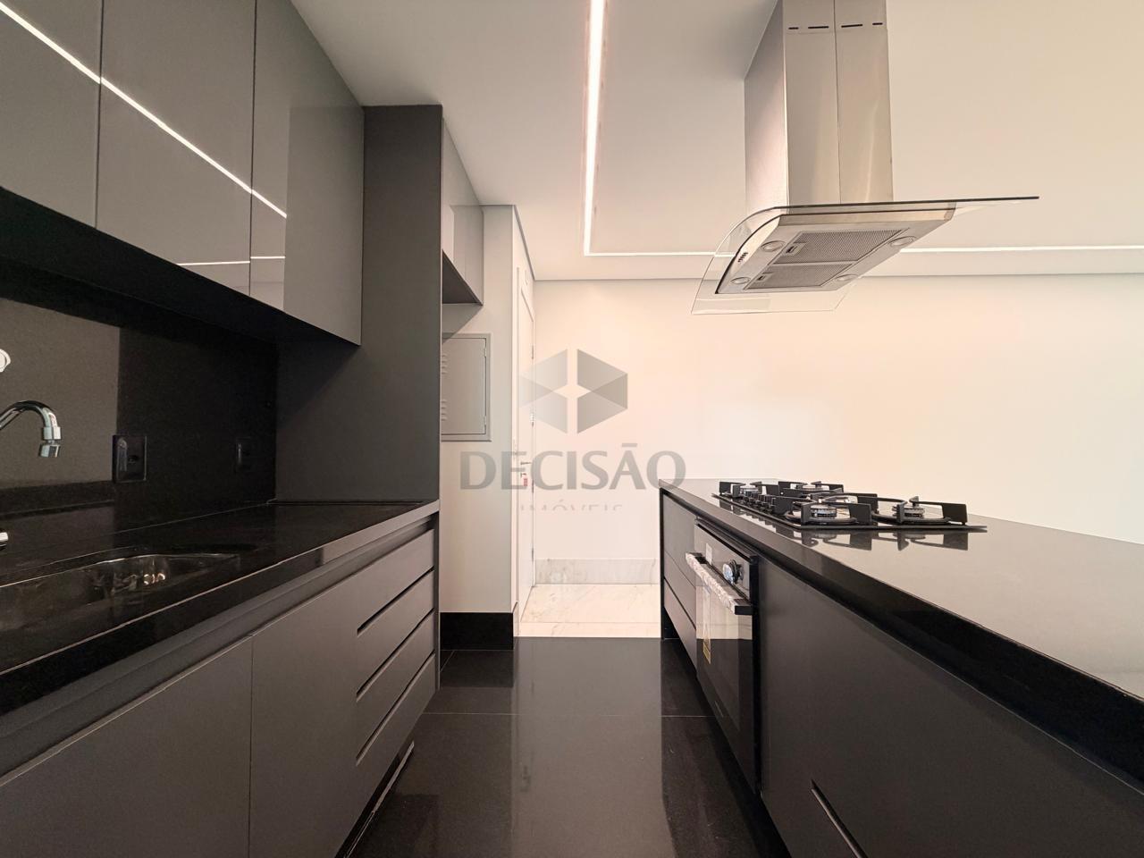 A cozinha conta com bancadas e piso em granito preto, marcenaria nova, cooktop e coifa, além de área de serviço independente.