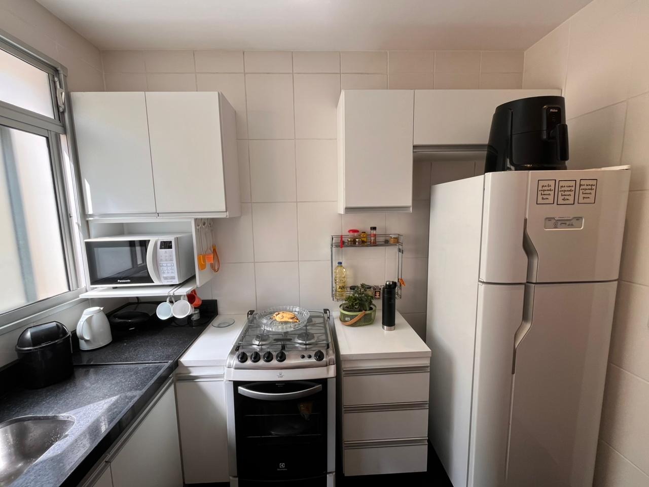 A cozinha é funcional e equipada com armários planejados, além de área de serviço, para convivência ou apoio doméstico.