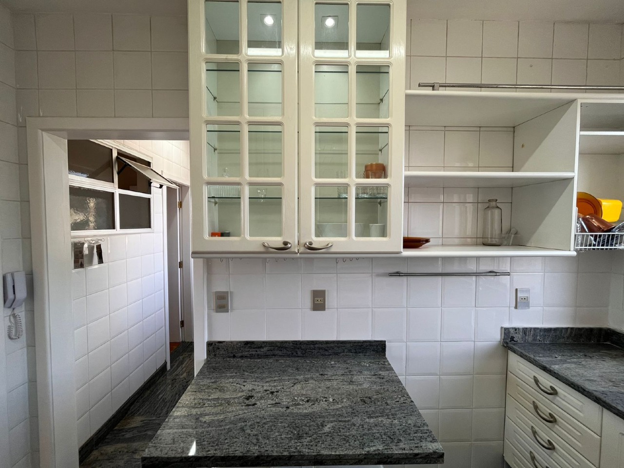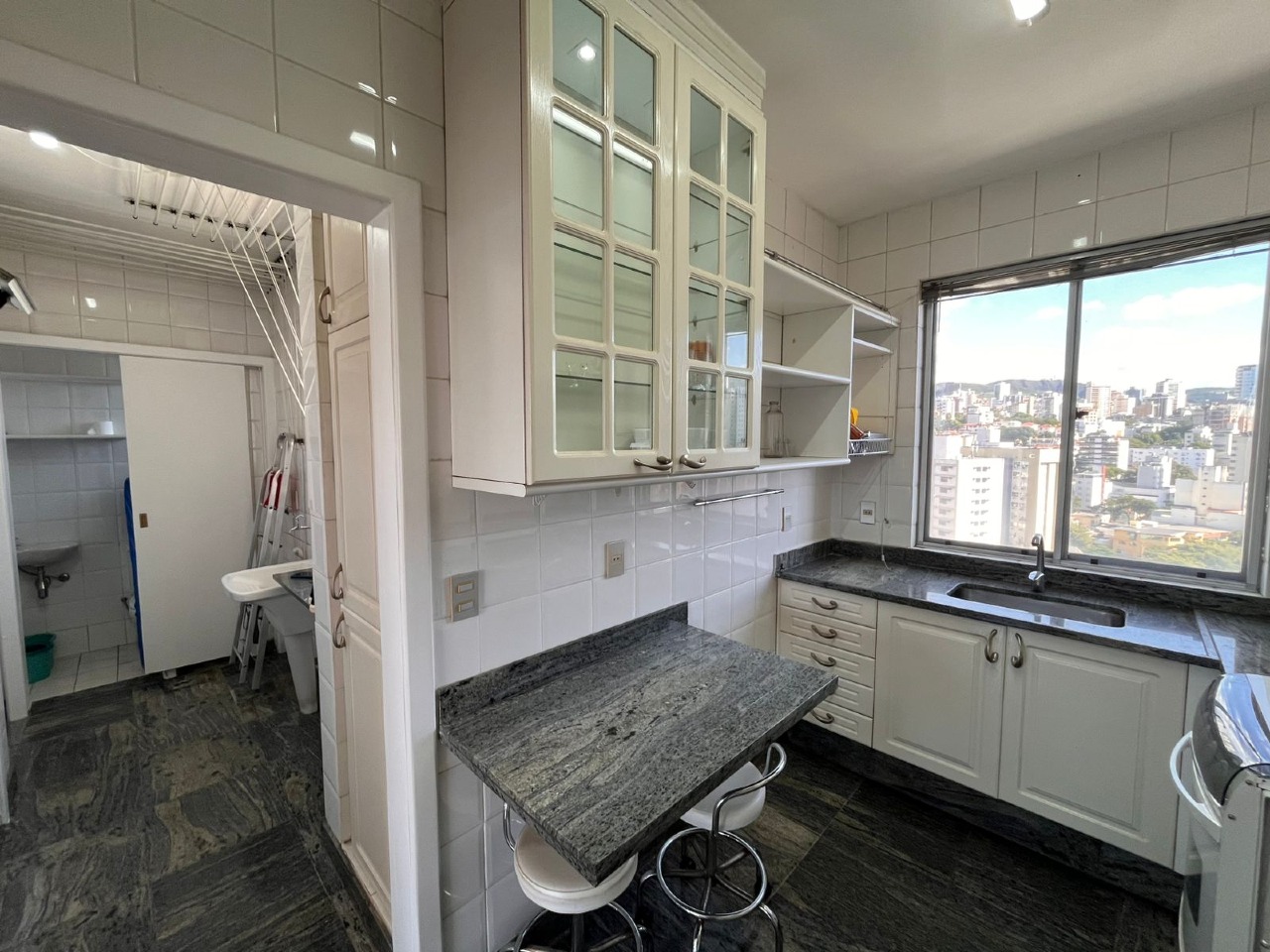 Cozinha toda planejada, com muitos armários, piso e bancadas em granito, área de serviço espaçosa, com DCE.