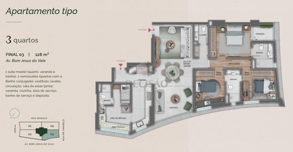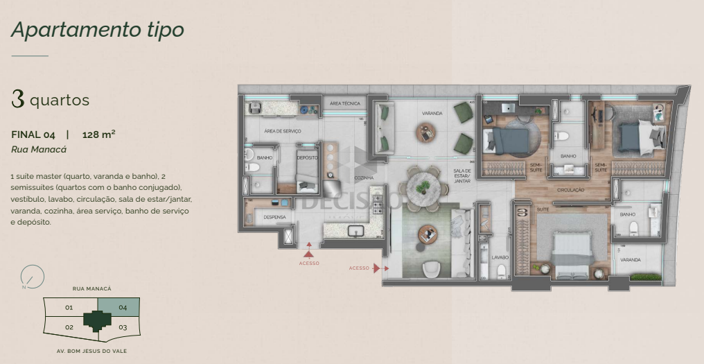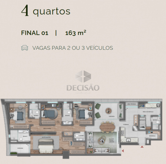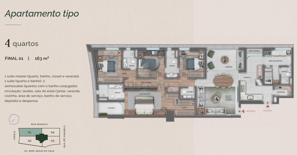 Apto 04 quartos (final 01 e04): Sala para 02 ambientes, lavabo, varanda, 04 quartos sendo 02 suítes e 02 semi-suítes, rouparia, cozinha, despensa, área de serviços e dce.