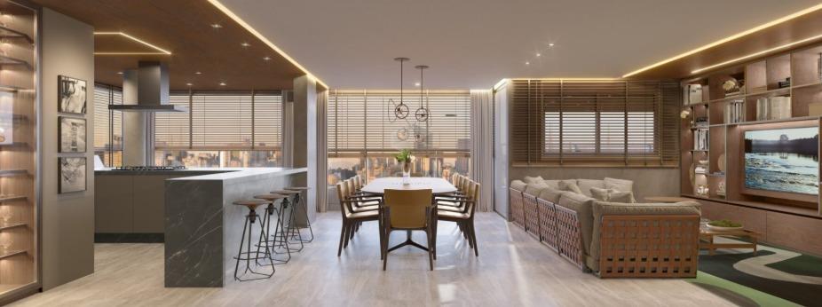 Apto: Sala para 02 ambientes (piso em porcelanato), lavabo, 04 quartos, sendo 02 suíte e 02 semi-suítes, cozinha com conceito aberto, terraço descoberto de 9,77m² que sai pela semi-suíte, área de serviços e banho de funcionários.