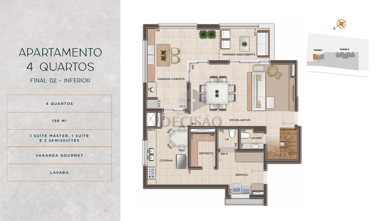 Apto Duplex: 1º Piso: Salão para 02 ambientes, varanda coberta e descoberta com ponto gourmet, lavabo, cozinha ampla, área de serviços, despensa e banho de serviços.