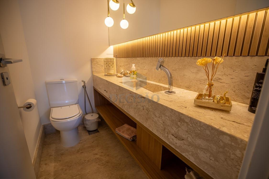 Salão para 03 ambientes, com varanda gourmet, lavabo, painel de tv, 02 suítes (master com closet), 02 semi suítes, rouparia, banhos (com armários, box blindex), copa, cozinha ampla com área de serviços e dependência de funcionários.