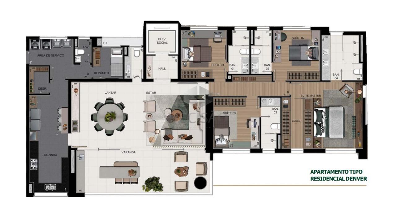 Apto: Salão para 02 ambientes, lavabo, varandão com vista, 04 suítes (sendo a master com closet), banhos com bancadas de granito, cozinha com bancadas de granito e bancada para lanches, despensa, área de serviços e dce.