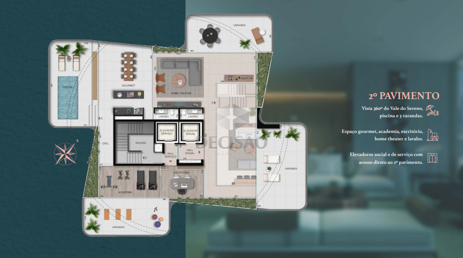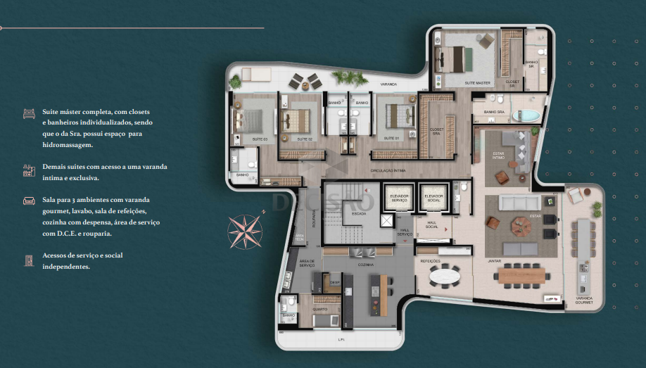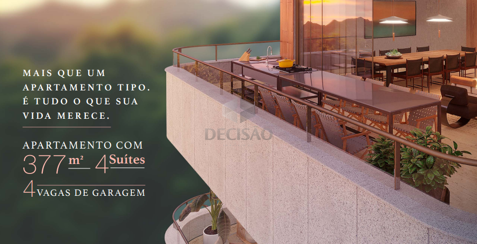 Apto: Salão para vários ambientes, com varandão gourmet e vista maravilhosa, lavabo, sala de jantar, 4 suítes (sendo master com 02 closets e 02 banheiros), 03 suítes com varanda, rouparia, banho com bancadas de granito, cozinha ampla com bancadas, despensa, área de serviços e dce.