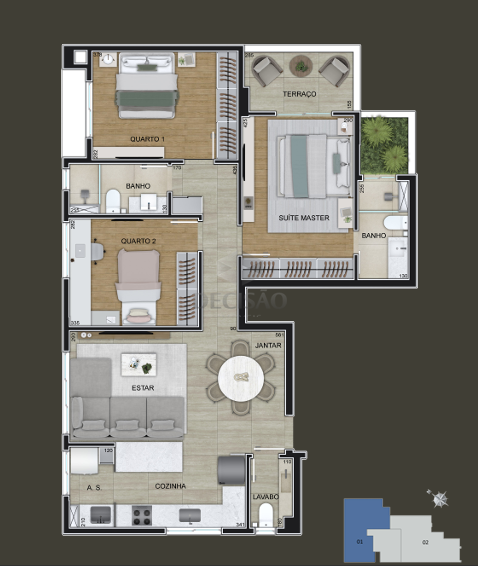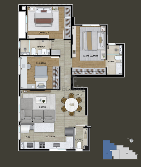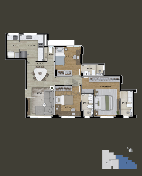Apto com final 01: Salão para 02 ambientes, lavabo, 03 quartos, sendo 01 suíte, banho social, cozinha ótima, área de serviços, área privativa.