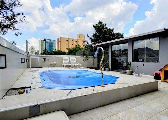 Área externa com piscina, espaço gourmet, banheiro, área livre.