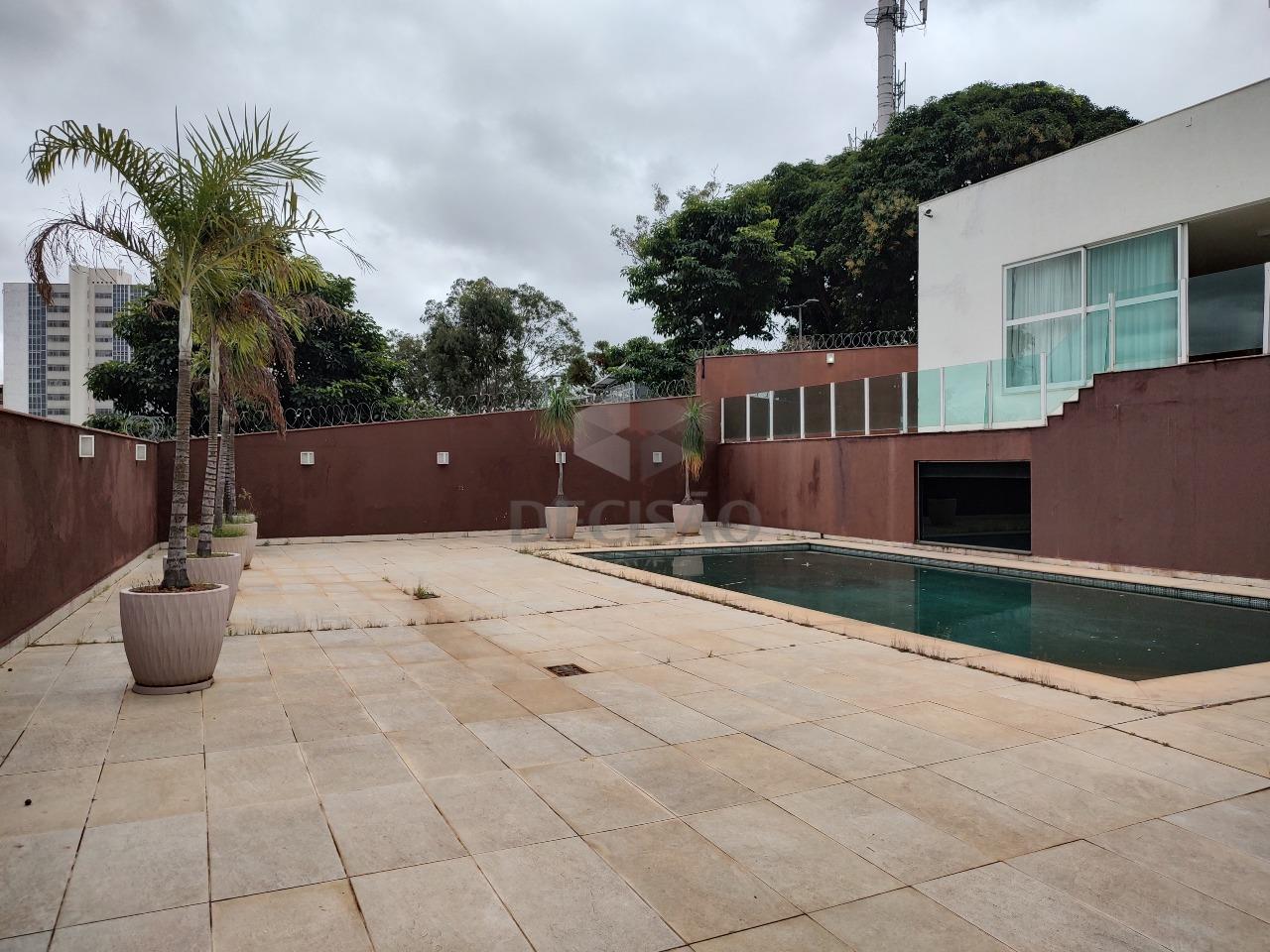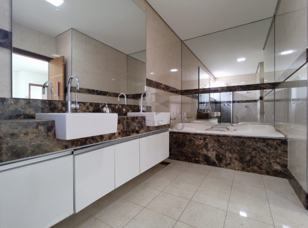 Piso inferior: Lavanderia, espaço gourmet, academia, sauna, boite com bancadas em granito, banheiro, ar-condicionado, saída de emergência, área externa descoberta com ampla piscina.