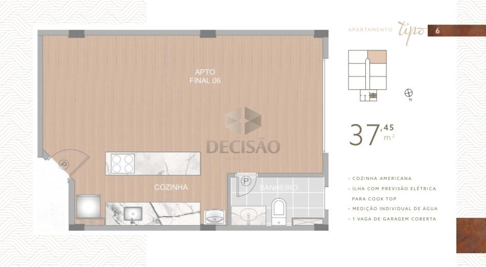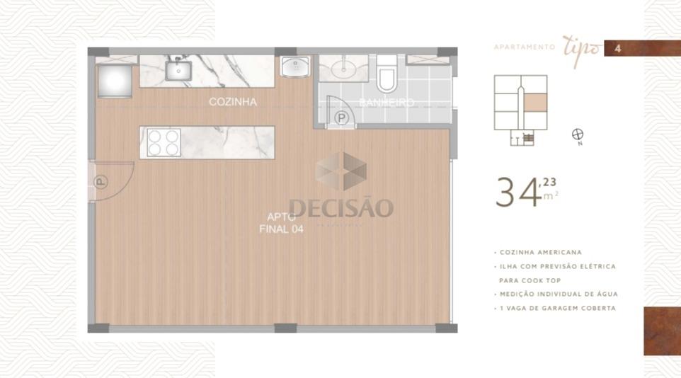 Cobertura: 1º Piso: Estilo studio, quarto/sala, cozinha americana com bancada de ilha, 01 banho e área de serviços.